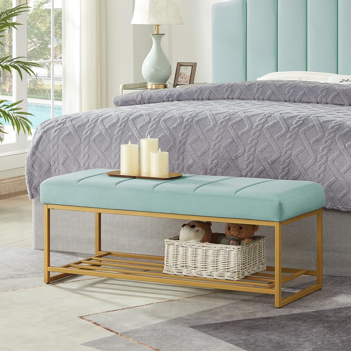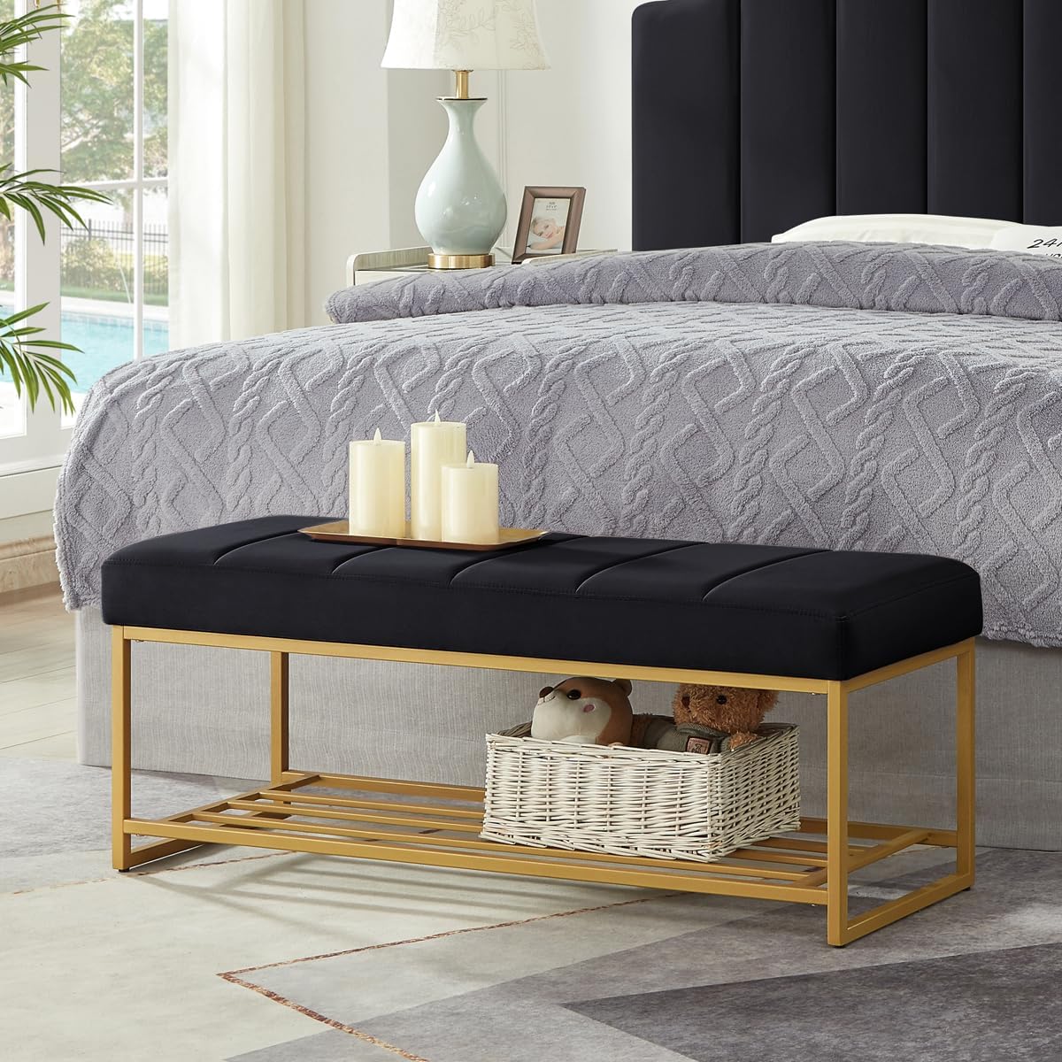 1. Spacious Storage & Functional Design This elegant bench features velvet seat cushion and gold metal shelf , perfect for stashing shoes or seasonal items. The compact yet sturdy design blends seamlessly into any living space, doubling as both a seating solution and a practical storage unit. 2. Premium Comfort & Durability Crafted with high-density memory foam padding, the cushion provides luxurious seating comfort while resisting wear and tear. The double-layer velvet upholstery is soft to the touch, stain-resistant, and easy to clean, ensuring longevity for daily use. 3. Product Size: 43.25"X15.5"X17 ", Material: Velvet + Metal frame+TB117 Foam.