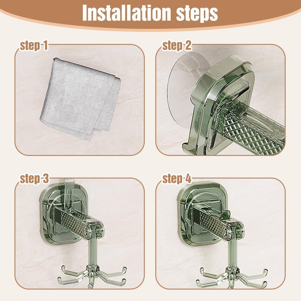 • EASY TO USE: This is a non-punch sundries hook, which is very convenient to install and use. Wipe the smooth surface dry with a rag, tear the protective film of the suction cup, press hard to the smooth wall, and twist to the right to complete the installation.
