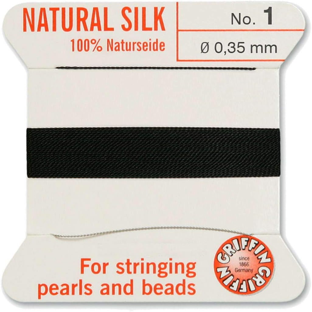 Griffin silk beading thread with integrated needle, made in Germany. The high-quality woven silk thread is particularly stable, tear-resistant and flexible. The needle prevents the hassle of threading into small eyelets and no need to use double thread. With this thread you can easily thread beads, gemstones, glass pearls and freshwater pearls. It is also suitable for making knotted necklaces.