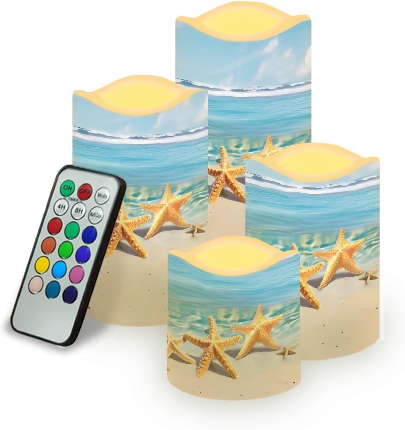 4 Packs Flameless Candles Sets(not battery include) Material:Premium frosted plastic. Color: ivory color Candles comes in 4 different size: --Diameter 7.6cm/3inch Height 7.5cm/2.9inch --Diameter 7.6cm/3inch Height 10cm/3.9inch --Diameter 7.6cm/3inch Height 12.2cm/4.9inch --Diameter 7.6cm/3inch Height 14.5cm/5.7inch Features: --with remote control,12 colors for you choose,have 4-hour or 8-hour timing mode --warm yellow tealights with miniature flicker --turn on/ off manually. --battery operated by 3 x AAA batteries. (Batteries not Included) --these flameless candles set is long lasting,buy them once, enjoy them for years to come! --suit for any spaces,any weather,indoor or outdoor. --4 pieces battery candles,create a romantic atmosphere and sparks interest for wedding,parties,home,birthday,festival and other occasions. without the worry of fire hazard, wax melting or allergic scent, warmer and peaceful atmosphere will make you enjoy your event.You will love it. Using Tips: 1.When the battery is too weak for normal power supply, your flameless candle will dim light, please turn off the candle and replace the battery. 2.Do not mix old or new batteries. 3.when not in use for a long time, please remove the battery from the LED candle. Note: 1.Due to the different camera or lighting environment, please allow a little chromatic aberration. 2.Due to different measurement methods, please allow an error of 1-3mm. Thank you! 3.Thank you for your business! If you have any questions, please don't hesitate to contact us directly.