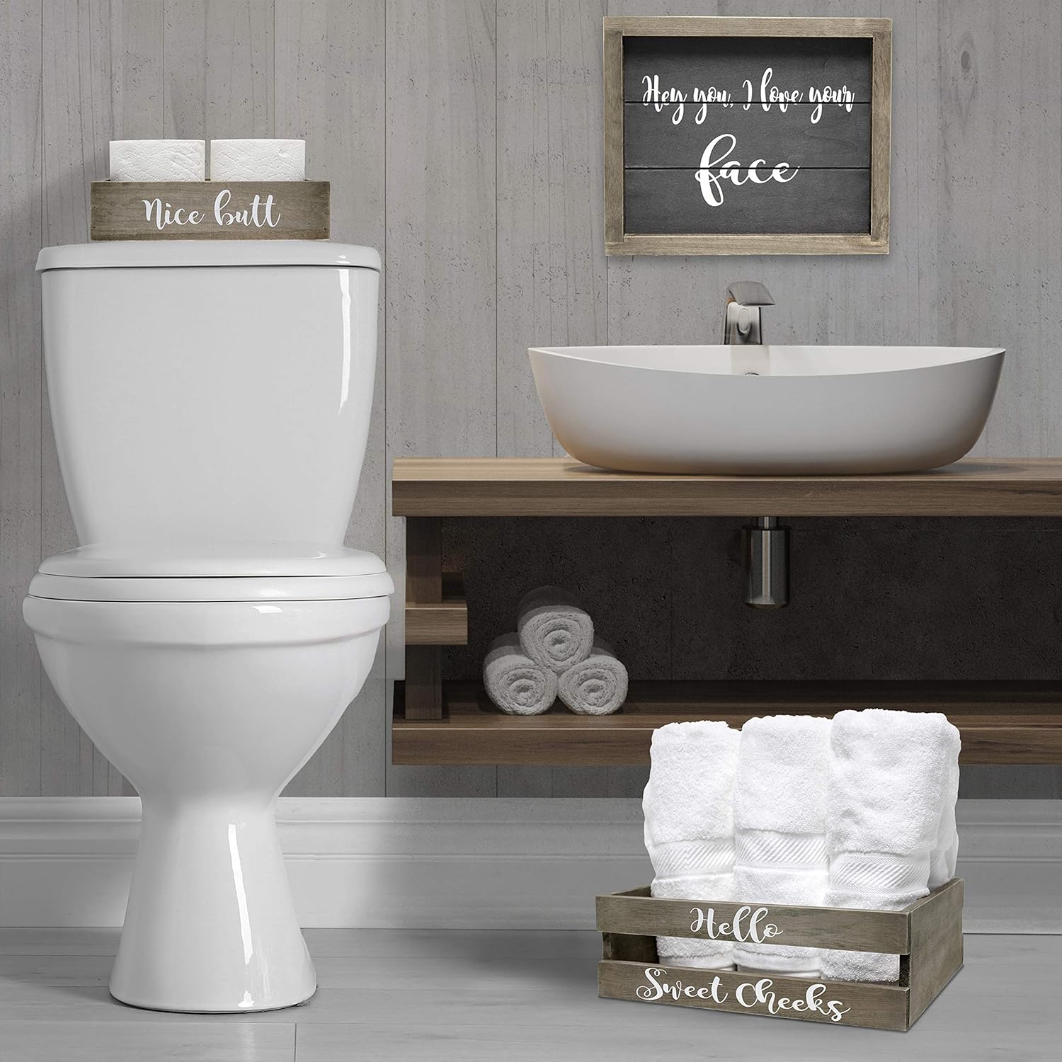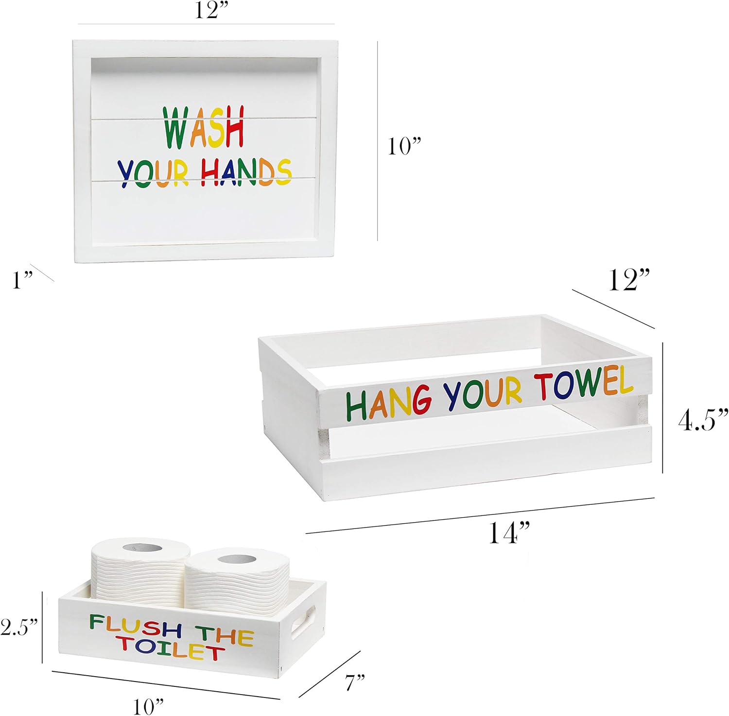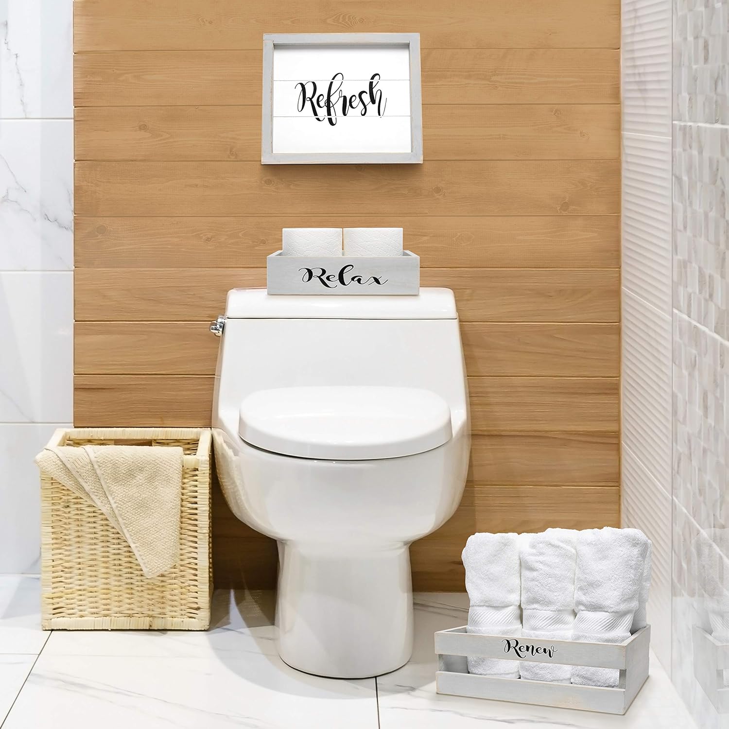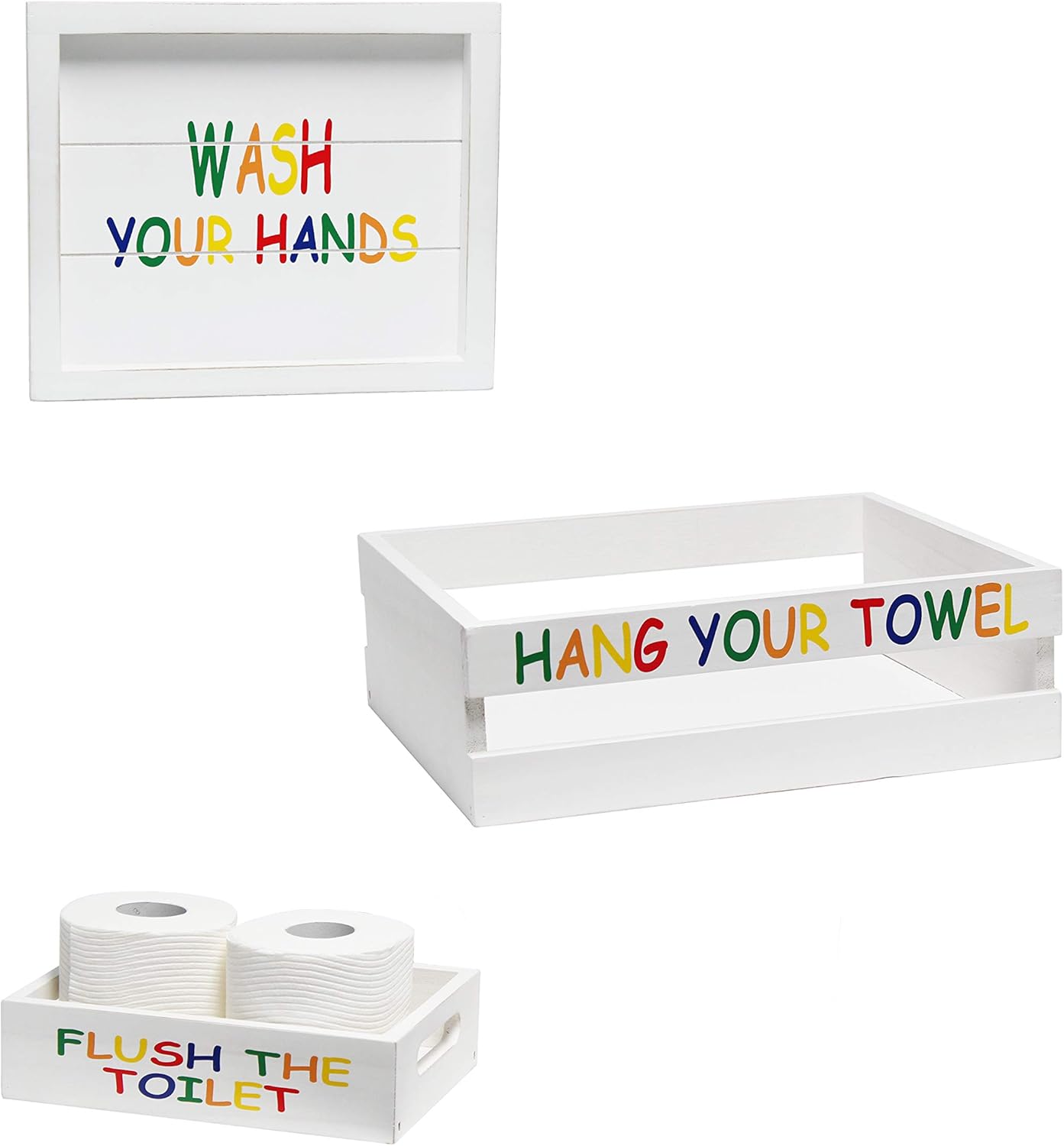 Revamp your bathroom with this three piece matching decorative set. This set will give your bathroom a complete, cohesive look. It includes 1 decorative frame, 1 toilet paper holder and 1 towel holder in a stylish, clean finish to give your bathroom the perfect update!