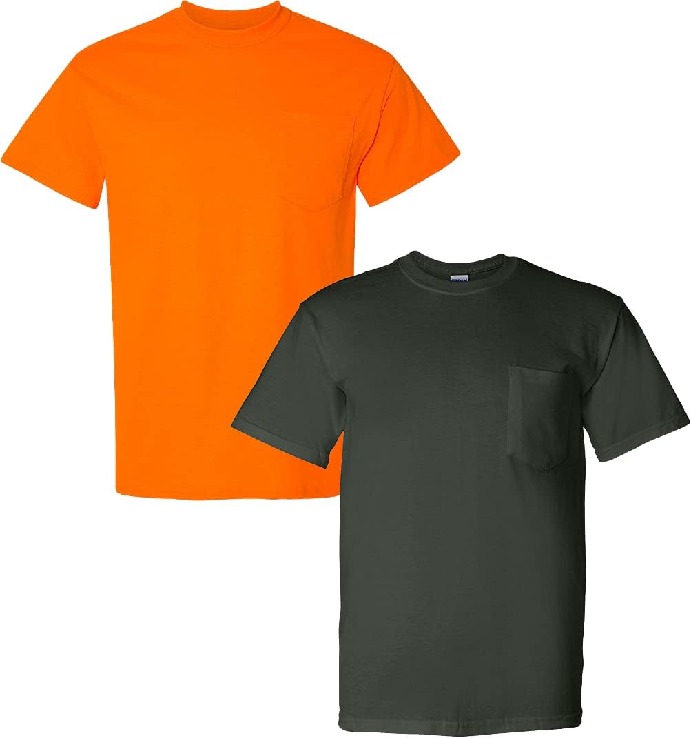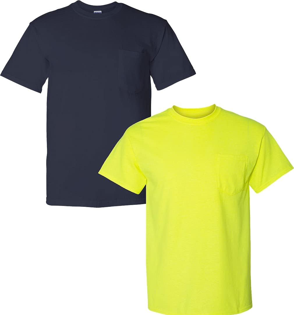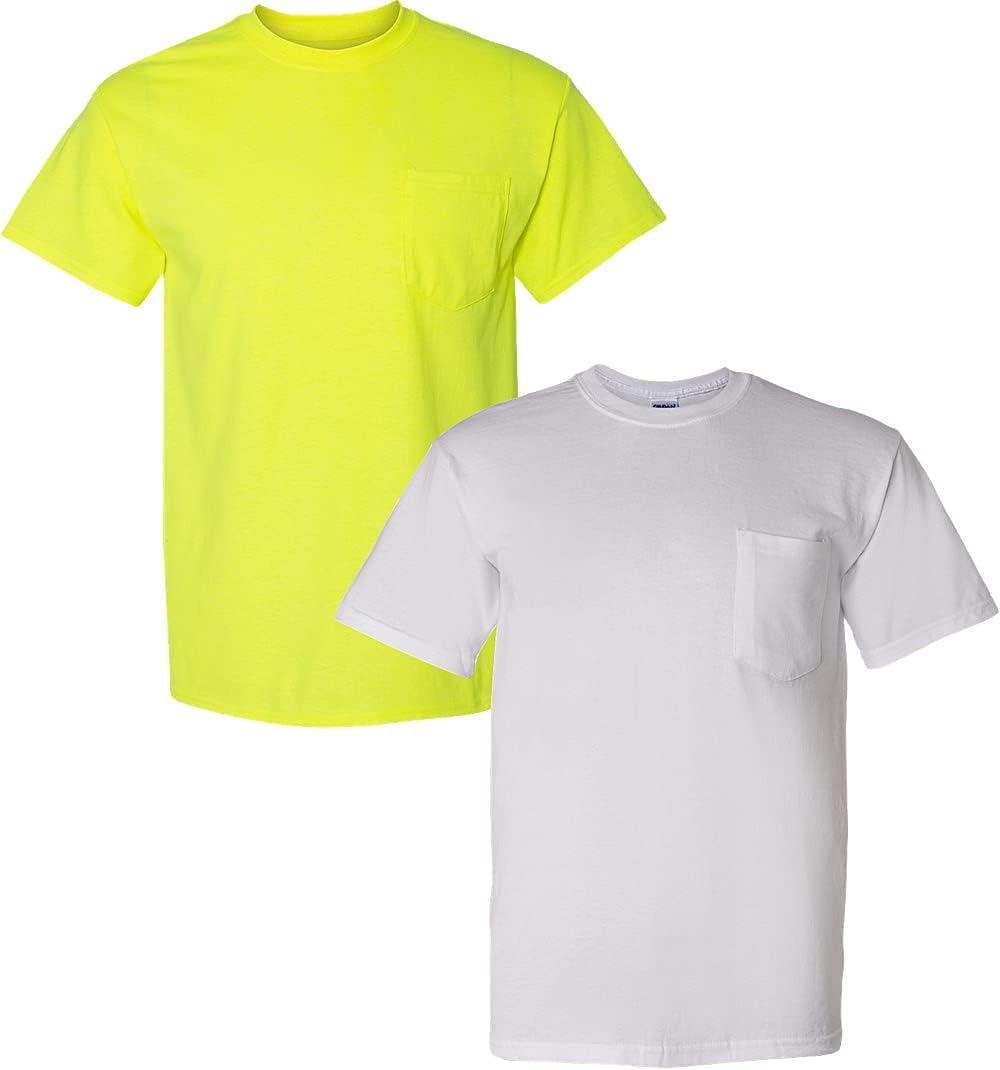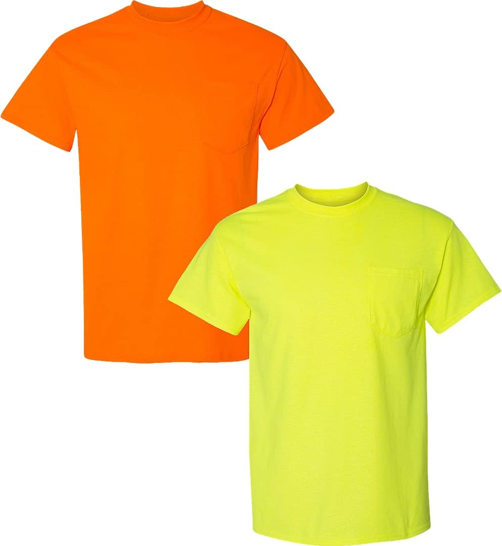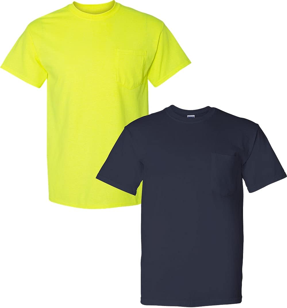 Classic fit. Taped neck and shoulders. 5.5 oz., 50/50 preshrunk cotton/polyester. Seamless double needle 7/8" collar. Single needle left chest set pocket. Quarter-turned to eliminate center crease. Double needle pocket, sleeve and bottom hems. Safety Green: Compliant with ANSI / ISEA 107. DryBlend technology: delivers moisture-wicking properties.