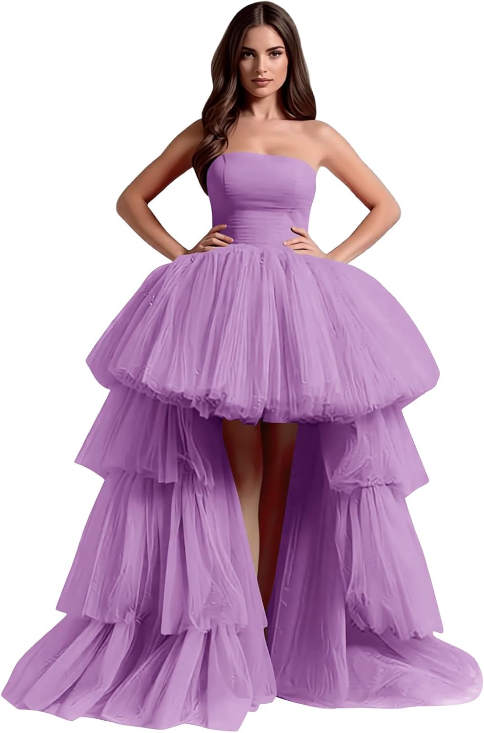 High Low Tulle Prom Gowns Strapless Evening Party Dress with Train Ruffles Sleeveless Pageant Tutu Ballgowns