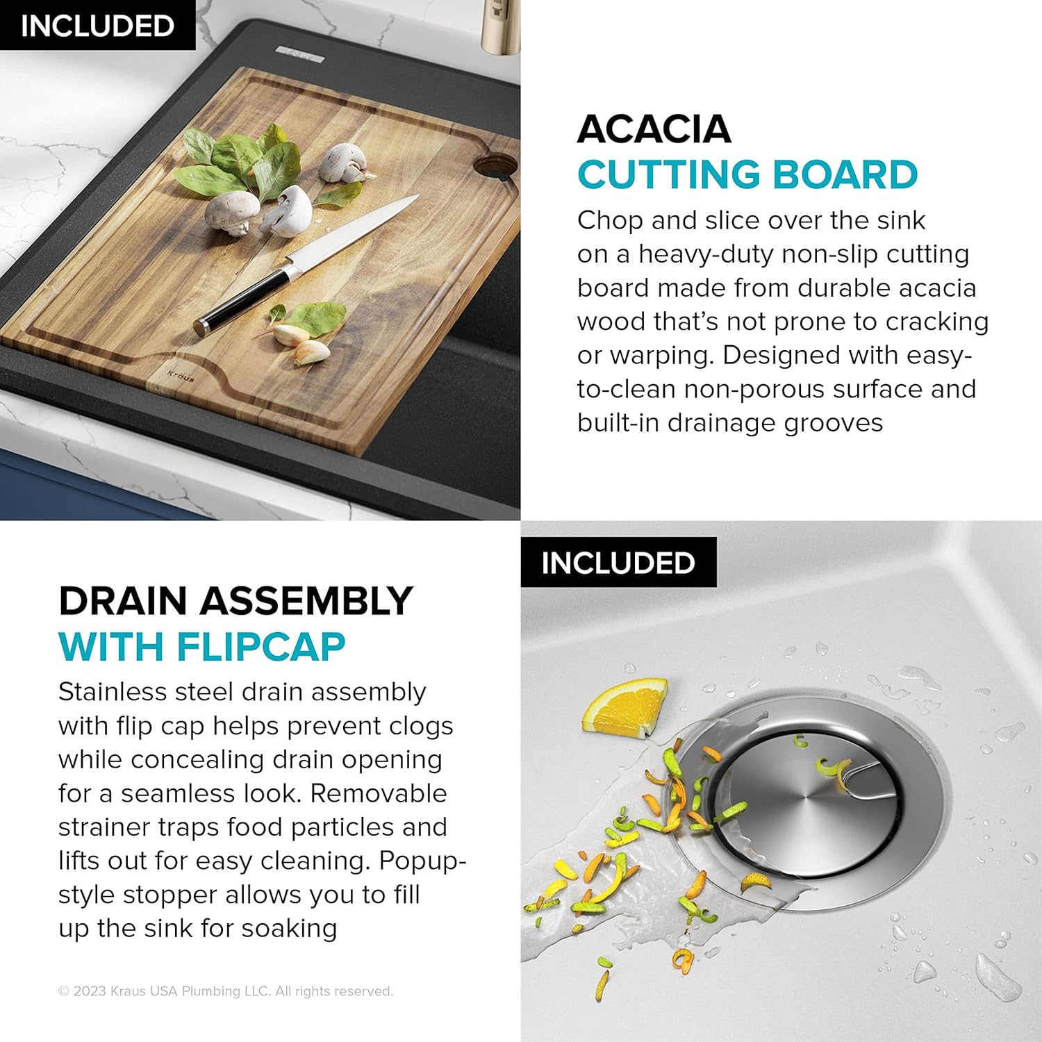 | Included Components | Granite composite drop-in workstation sink, heavy-duty acacia hardwood cutting board/sink cover, stainless steel drain assembly with strainer |