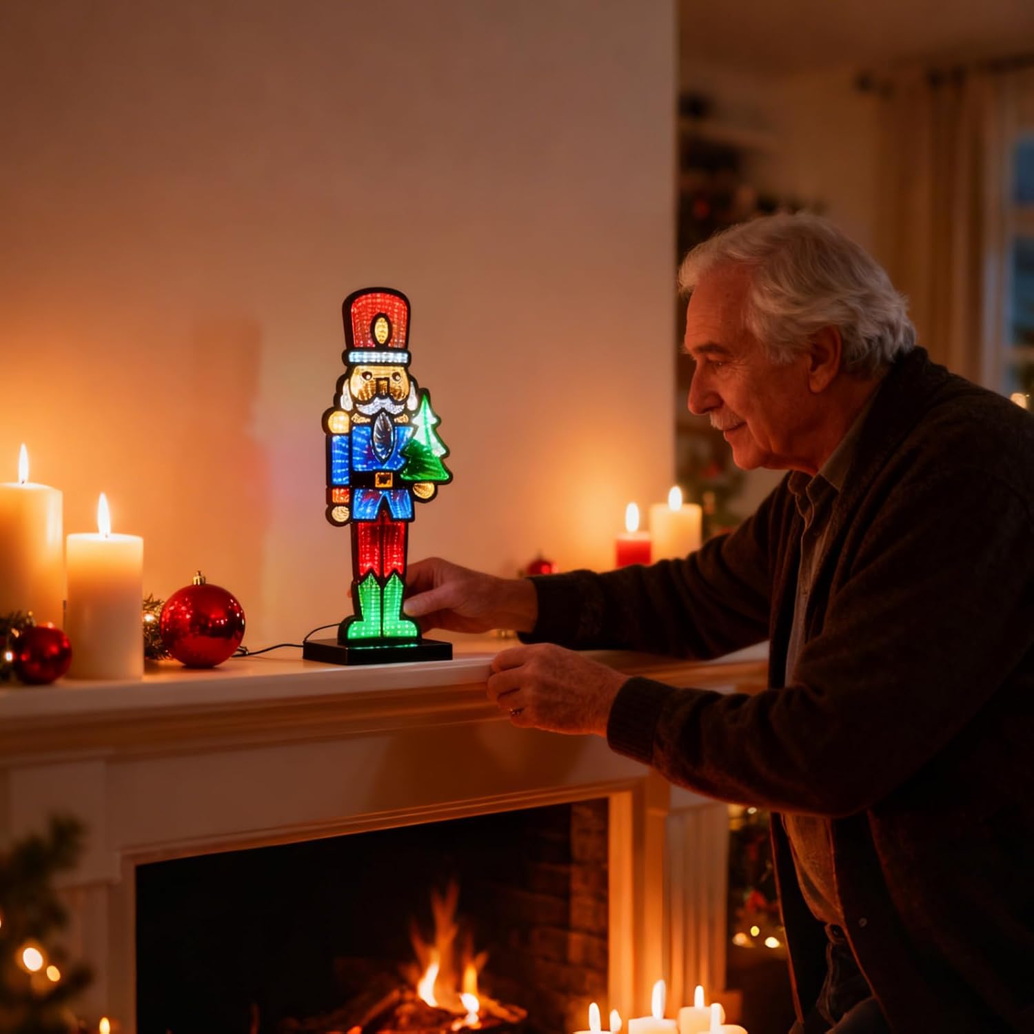 Feature:Classic Festive Design:Traditional nutcracker soldier design with modern LED illumination creates timeless holiday ambiance for all ages.Infinity Mirror Effect:264 multicolored LEDs produce captivating depth and brightness through innovative mirror technology.Versatile Placement Options:Suitable for living rooms, hallways, fireplaces, entryways, and Christmas tree areas in various decor styles.Thoughtful Holiday Gift:Makes meaningful Christmas present that creates warm festive memories for family and friends.Convenient USB Power:Energy-efficient USB operation ensures quiet, hassle-free setup with flexible placement options.Specifications: Size: 40×15.5×7cm/15.8×6.1×2.8inch Material: Acrylic LED Count: 264 Beads Power Supply: USB Direct PlugPacking List: Christmas Luminous Mirror Nutcracker ×1 Piece
