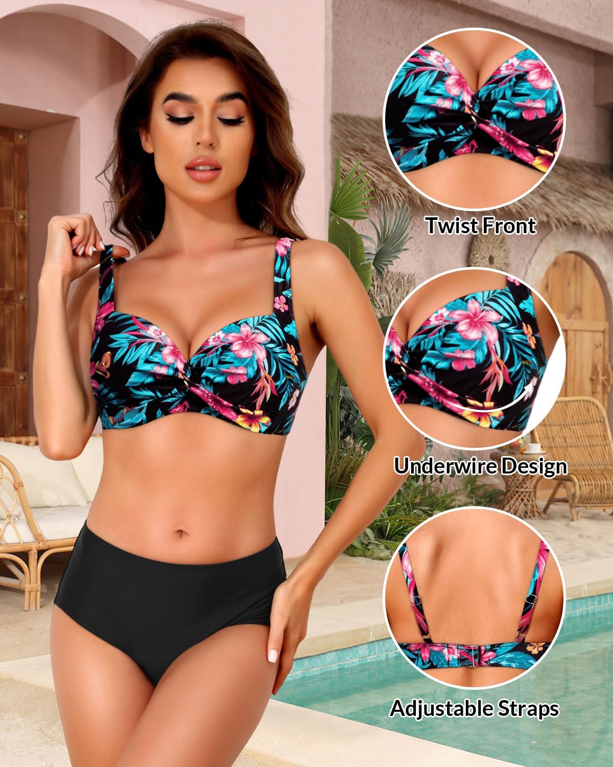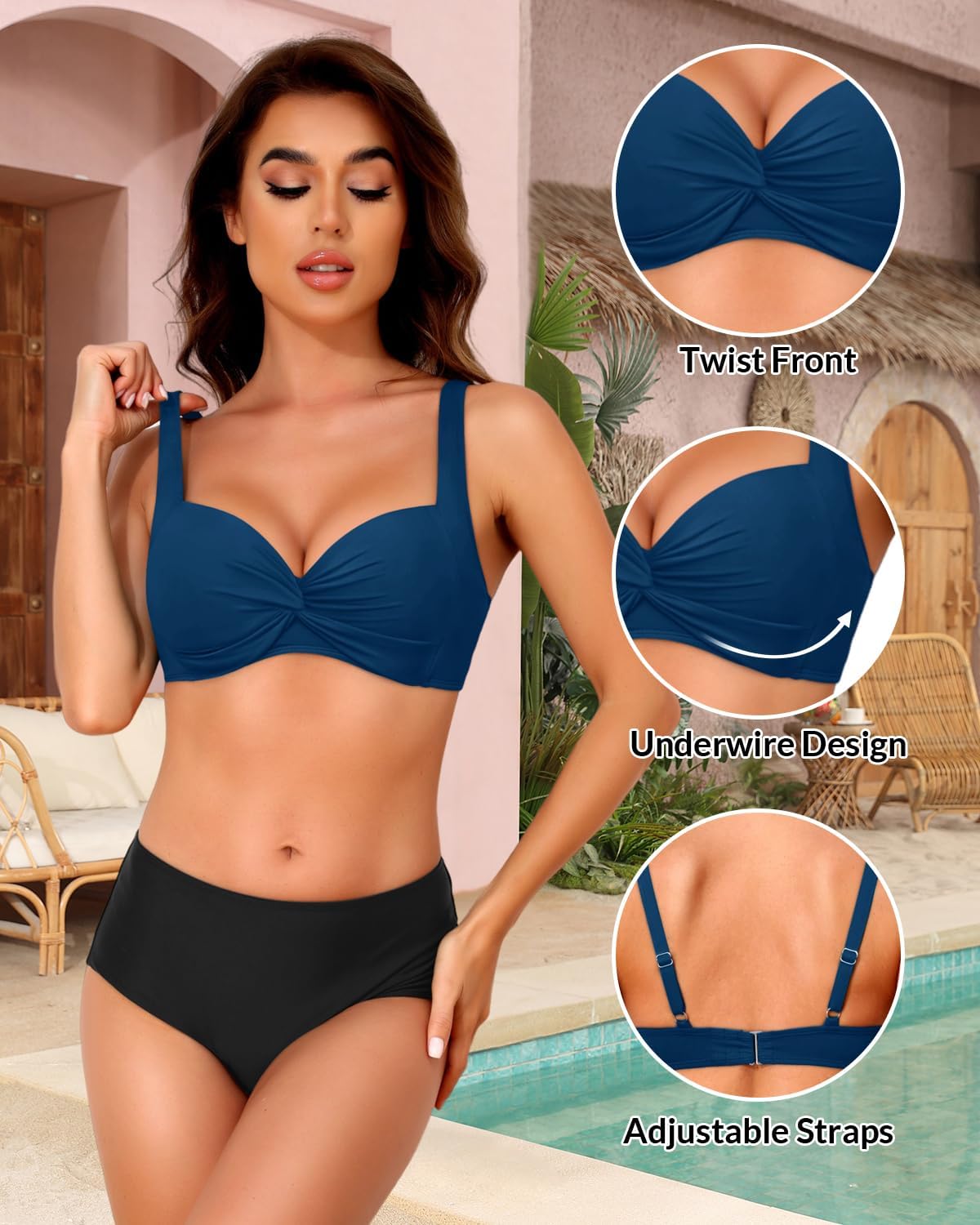 Push Up Swimsuit Top: The underwire bikini top with adjustable straps provides maximum support for a push up effect.