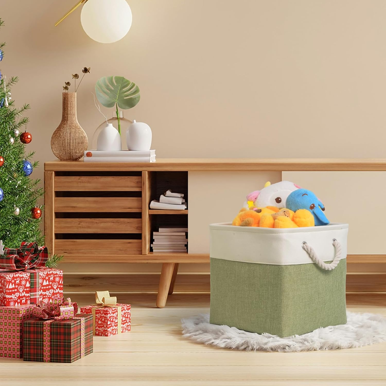 • STYLISH & PRACTICAL DESIGN Featuring dual-color stitching and two strong cotton rope handles, these cube storage bins offer a clean, modern look while being easy to pull off shelves or carry room to room. The neutral tone makes them both decorative and functional — stylish enough for display, strong enough for heavy-duty use.