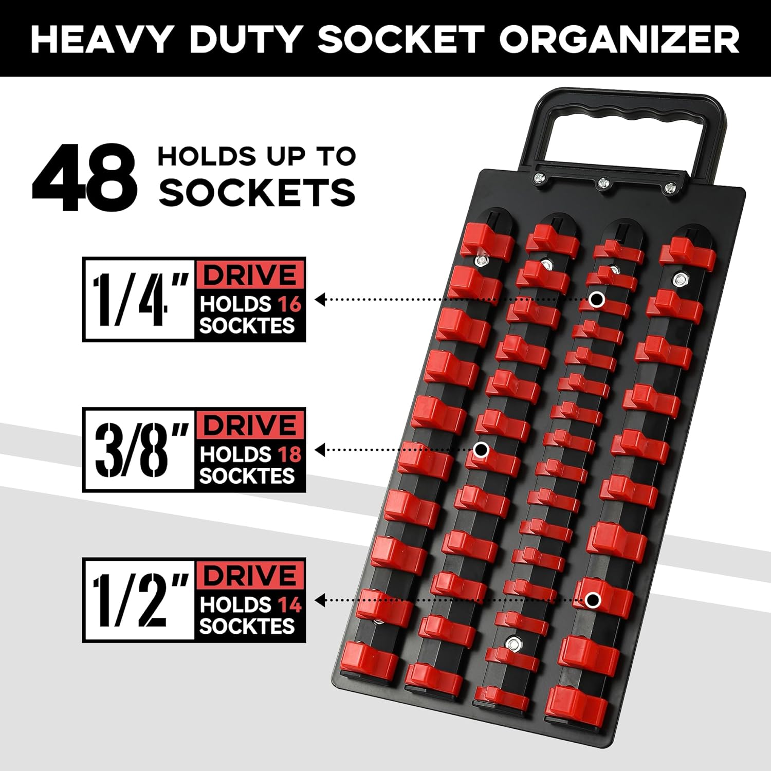 • Heavy Duty: This socket organizer is constructed with molded ABS rails, durable steel tray and portable handle, capable of accommodating both deep and shallow sockets in both SAE(Inch) and metric sizes.
