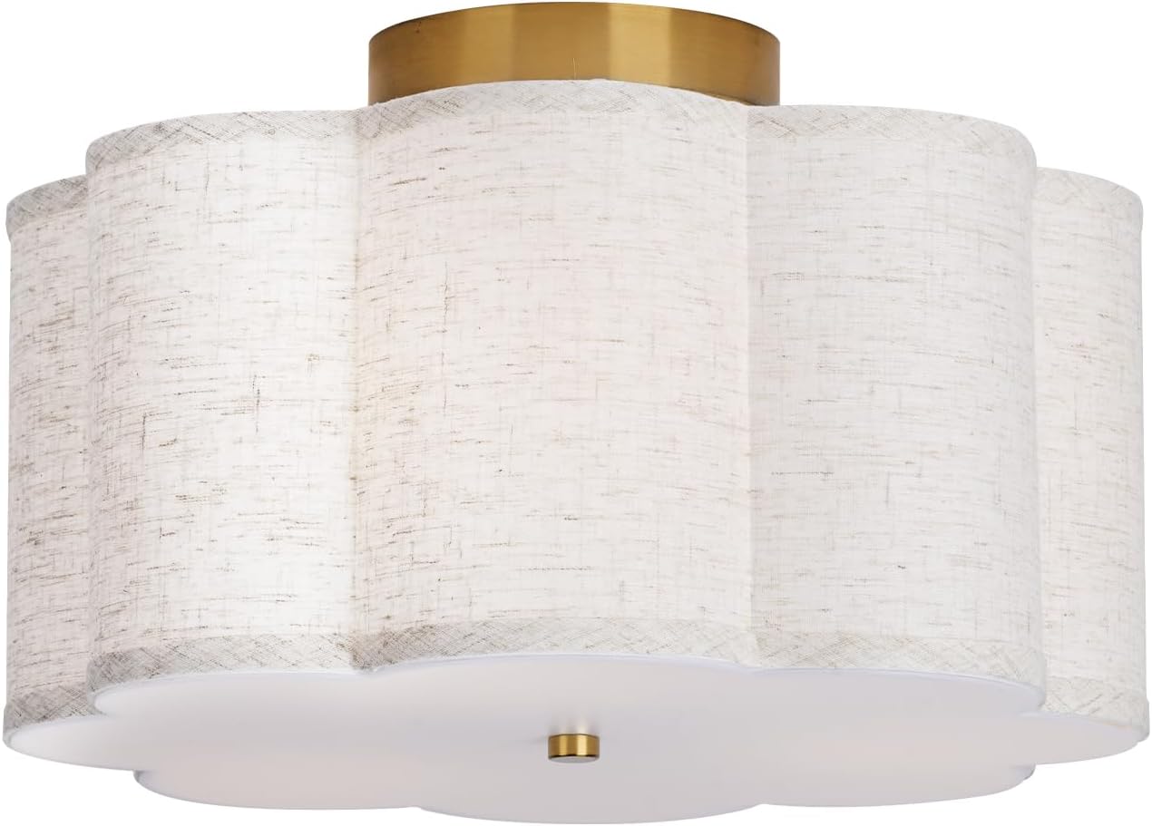 • Refined Design:This flush mount ceiling light is elegantly crafted with a linen fabric shade and adorned with exquisite golden round nuts.The centerpiece of its design is the flower-shaped lampshade, which not only maintains a modern appeal but also exudes a touch of charm and tranquility.It's an ideal choice for overhead lighting in children's rooms and nurseries.