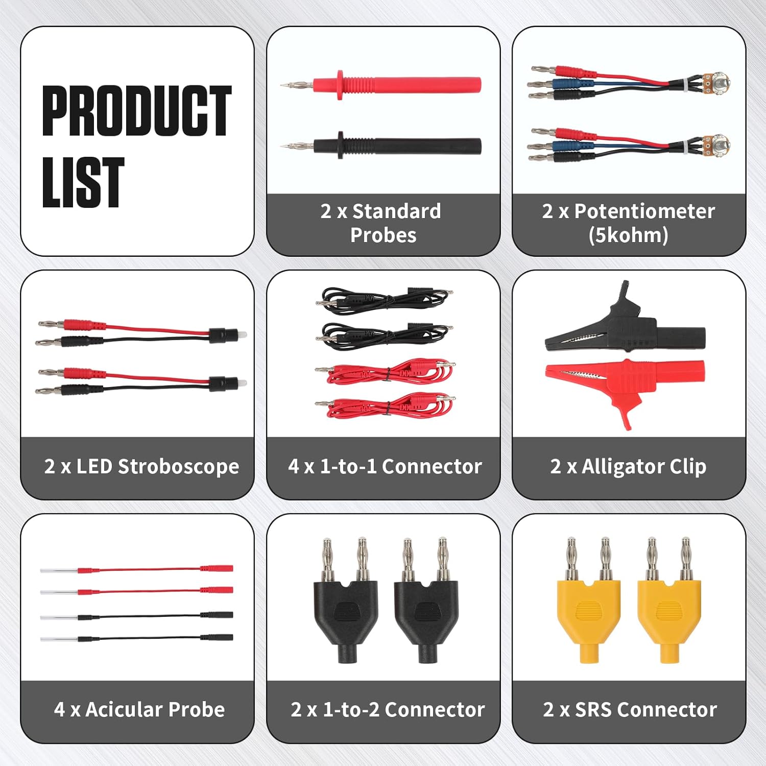 • [PACKAGE INCLUDED]--All components store in a black case: 28 terminal connectors, 2 potentiometers (5KΩ), 2 standard probes, 2 alligator clips, 2 SRS connectors, 2 splitter connectors, 4 micro-tip probes, 2 LED test lights, and 4 direct connectors. Everything stays organized for immediate use.
