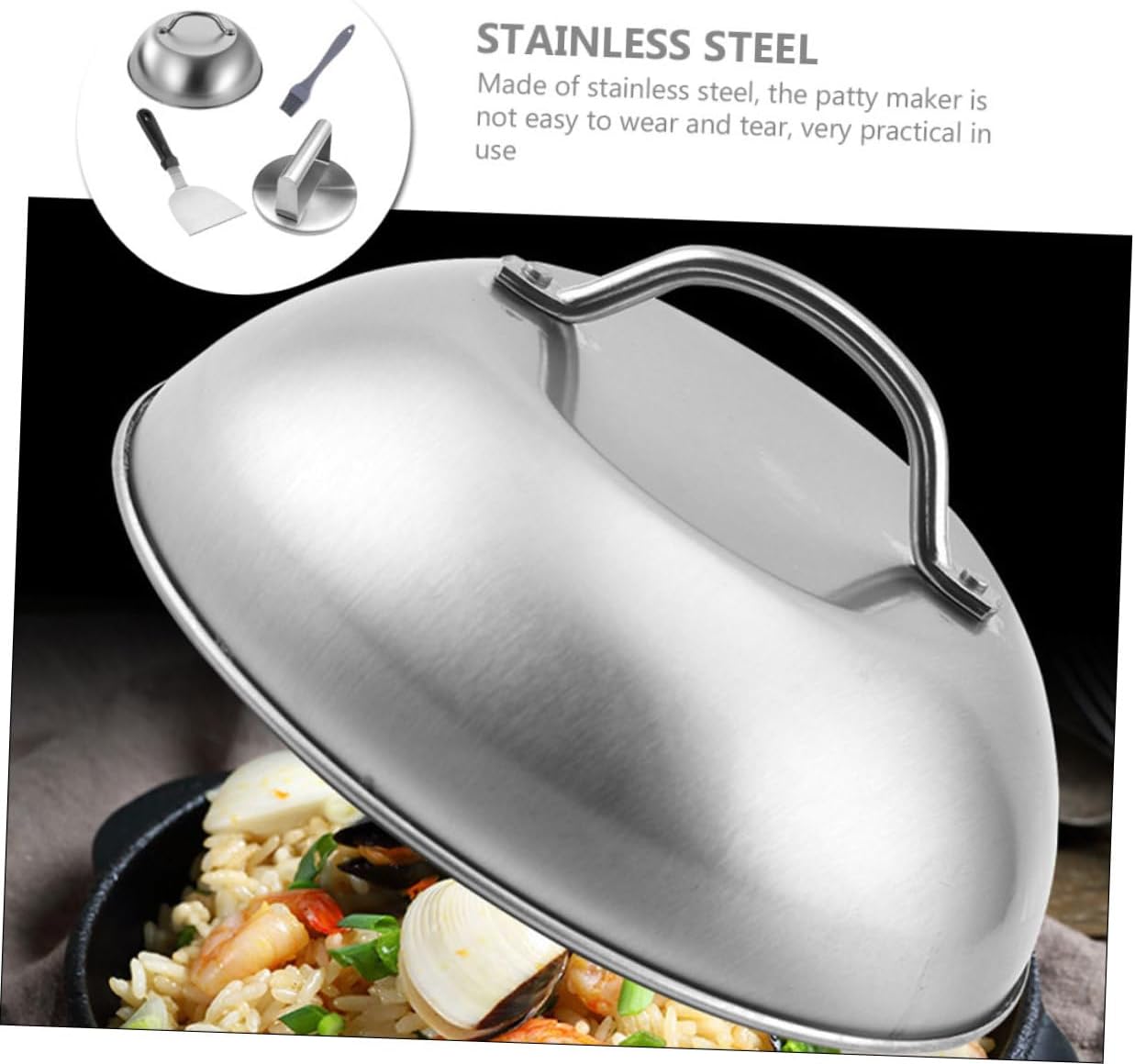 Package Include 1 x Burger Press 1 x Lid 1 x Brush 1 x Shovel Characteristics -Size (brush):15.00X3.00X1.00cm/5.89X1.18X0.39in smash burger press -Size (shovel):22.00X10.20X1.00cm/8.65X4.01X0.39in metal burger marker -Size (lid):22.60X22.60X10.50cm/8.88X8.88X4.13in burger press -Material:Stainless steel stainless steel burger press -Color:Assorted Color kitchen tool -Size (press):15.10X15.10X8.70cm/5.93X5.93X3.42in burger press tool -Made of stainless steel, the patty maker is not easy to wear and tear, very practical in use burger making tool. -This Burger Press patty maker set can make an even-sized patty quickly, and the handle design is convenient to press handle burger patty press. -It's a great and convenient to make a burger meat patty for friends or family at their patty maker. -Round edges and smooth surface make the press safe to touch and do not hurt your hands home pressing meat tool. -The rationalized design on the touch surface makes the patties form smoothly, makes the patties intact during the process, and speeds up the cooking process pressing meat .Goods Informationkitchen gadget Easy to use and clean.patty maker Though this Burger Press set is simple in design, it's so practical when you use it.meat pie press It has a non-stick coating, can quickly and easily the formed pie.handle burger patty press Manufactured with durable and practical material, safe and assured.metal burger shovel Easy to clean and maintain after use, no food after demoulding