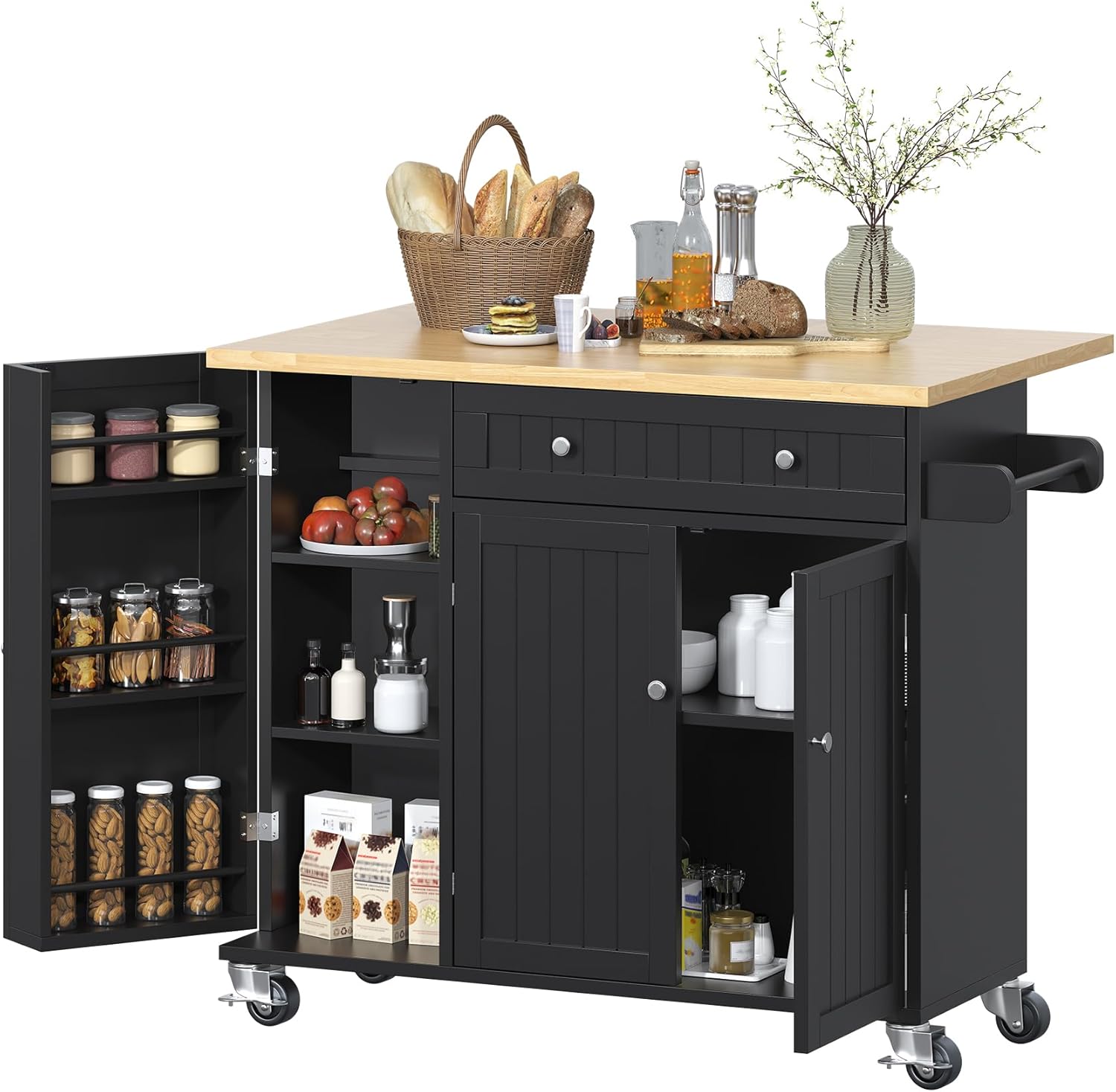 • 【Ample Storage Space】Our rolling kitchen island can serve as an additional cooking countertop or as a dining table with ample storage space. In addition, this buffer cabinet provides various storage spaces to keep your kitchen organized. A wide desktop allows for coffee machines and cooking books to be placed within reach, a large drawer and bottom cabinet make it easy to store kitchen supplies, and side doors open to reveal three shelves for storing beverages, snacks, or seasonings.