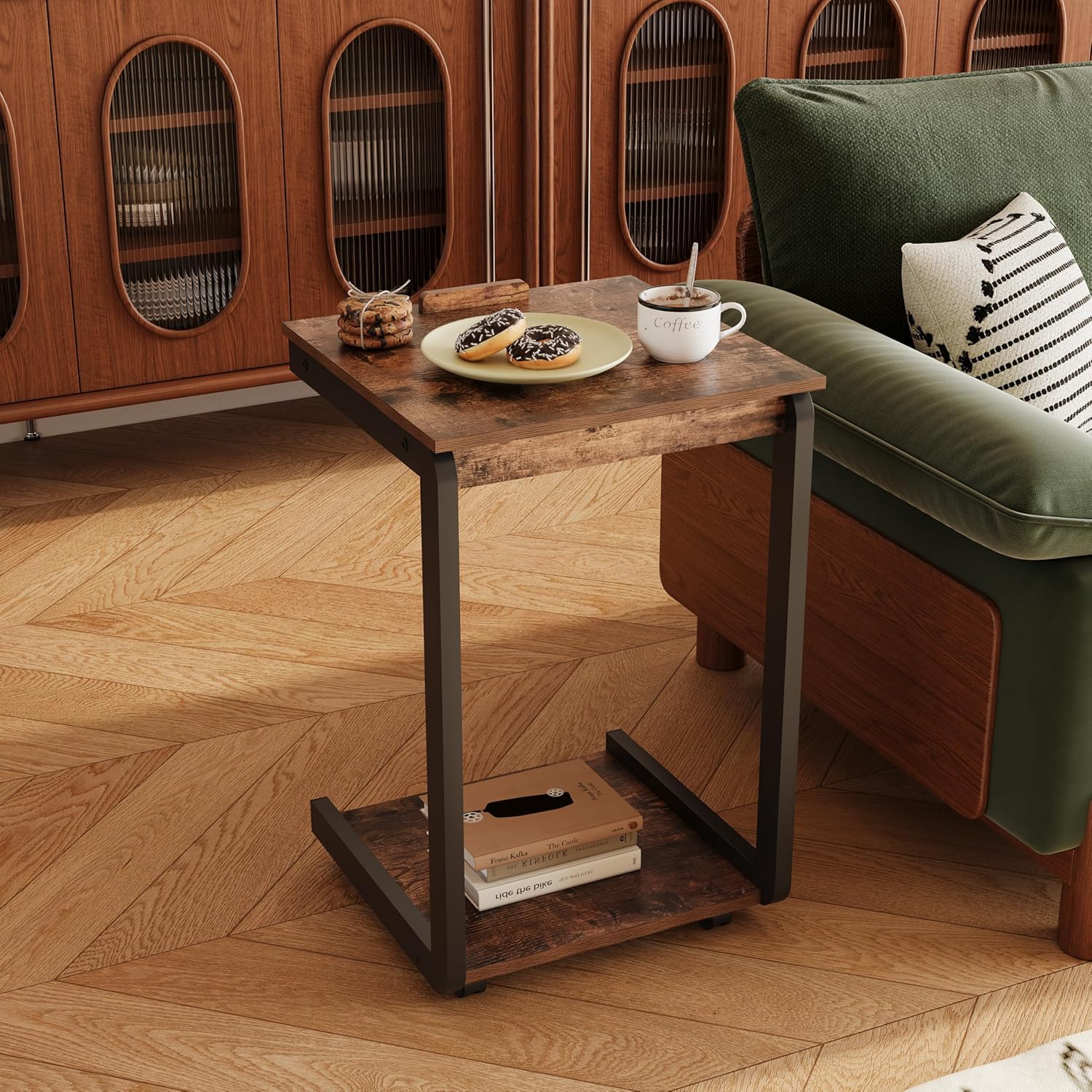 • Flexible Space Adaptability: The C-shaped side table is equipped with 360° swivel wheels, making it easy to slide under the sofa or bed. It helps save floor space. The wheels come with 2 locking mechanisms for easy movement or secure placement