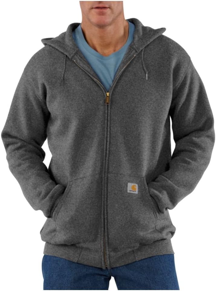 Carhartt's midweight hooded zip-front sweatshirt brings considerable comfort to cool-weather worksites its 50-percent cotton 50-percent polyester fleece blend provides plenty of warmth and a full-length brass front zipper let you regulate the temperature other features include an attached hood with adjustable drawstring, front hand-warmer pockets and rib-knit cuffs and waist band to keep out the cold heather gray fiber content is 70-percent cotton / 30-percent polyester charcoal heather fiber content is 55-percent cotton / 45-percent polyester