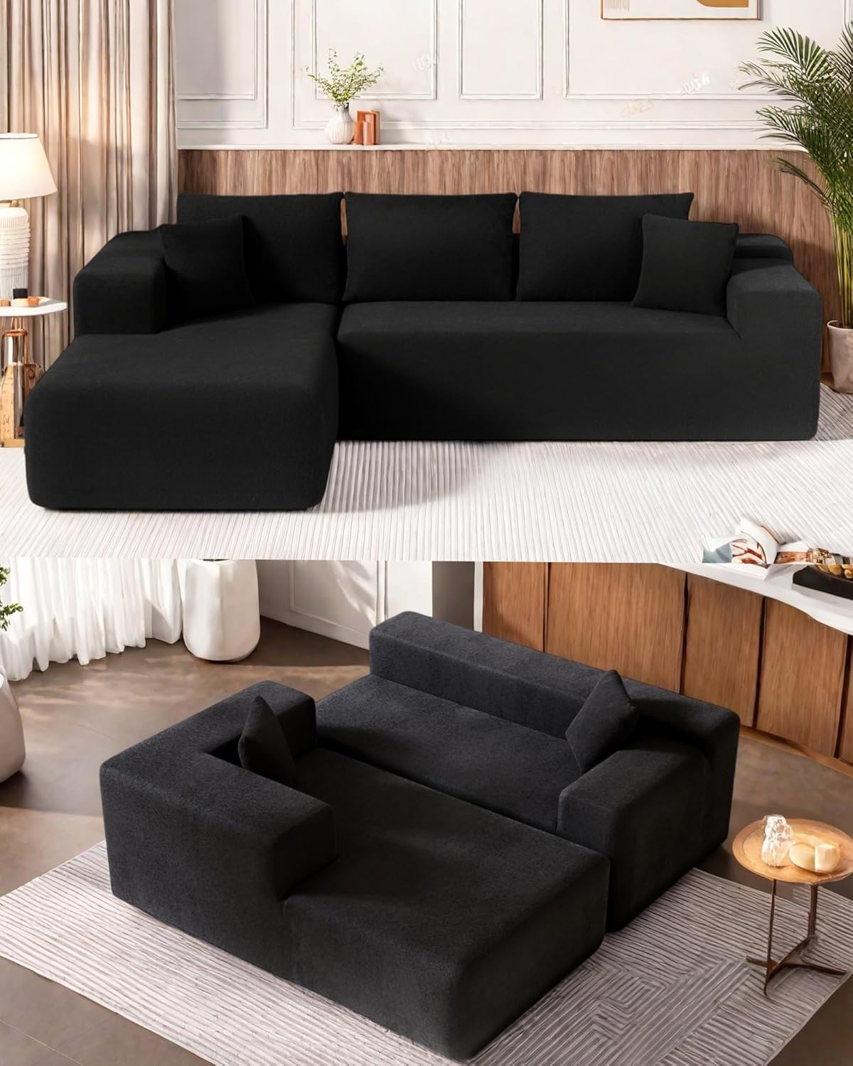 • No Assembly Required: Say goodbye to assembly stress, this L-shaped cloud modular sofa is ready to use anytime. Just open the package and gently tap each piece to restore its full shape, and it will fully expand in about 72 hours. Enjoy a tool-free, hassle-free experience from the start.