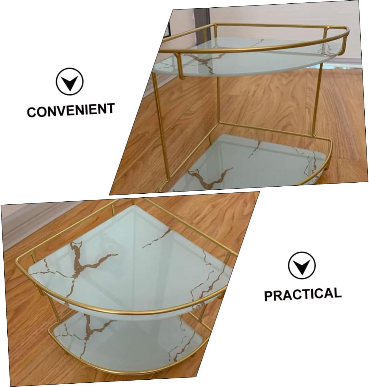 Package List 1 × Corner Shelf Characteristics -Product Info:Skin care storage rack - Color: Golden Bathroom Corner Rack - Material: Iron, glass Kitchen Storage Shelf - Size: 30.00X23.50X22.00cm/11.79X9.24X8.65in Toilet Storage Rack - Double layers can help you organize different items more easily, and it enables you to find things faster Desktop Storage Shelf. - Nice color and detailed workmanship, can create a new look to your place, also a wonderful decoration Cosmetics Storage Holder. - Simple structure, strong bearing capacity, can store and organize more items, bringing you great using feeling Shower Accessories. - It can be well applied to your bathroom, bedside or any places, helping you to store cosmetics or other sundries Bathroom Storage Holder. - Mainly made of iron and glass material, this desktop storage shelf is with excellent texture and longer service life Multipurpose Storage Rack.Goods InformationShower Accessories It has a reasonable double-layers design and practical functions, can play a nice storage and organization effect, convenient for you to find and sort items faster.Corner Storage Shelf Detailed workmanship, not easy to deform or damage, can well meet your needs and your quality of life.Toiletry Storage Holder This is a desktop storage rack made of iron and glass materials