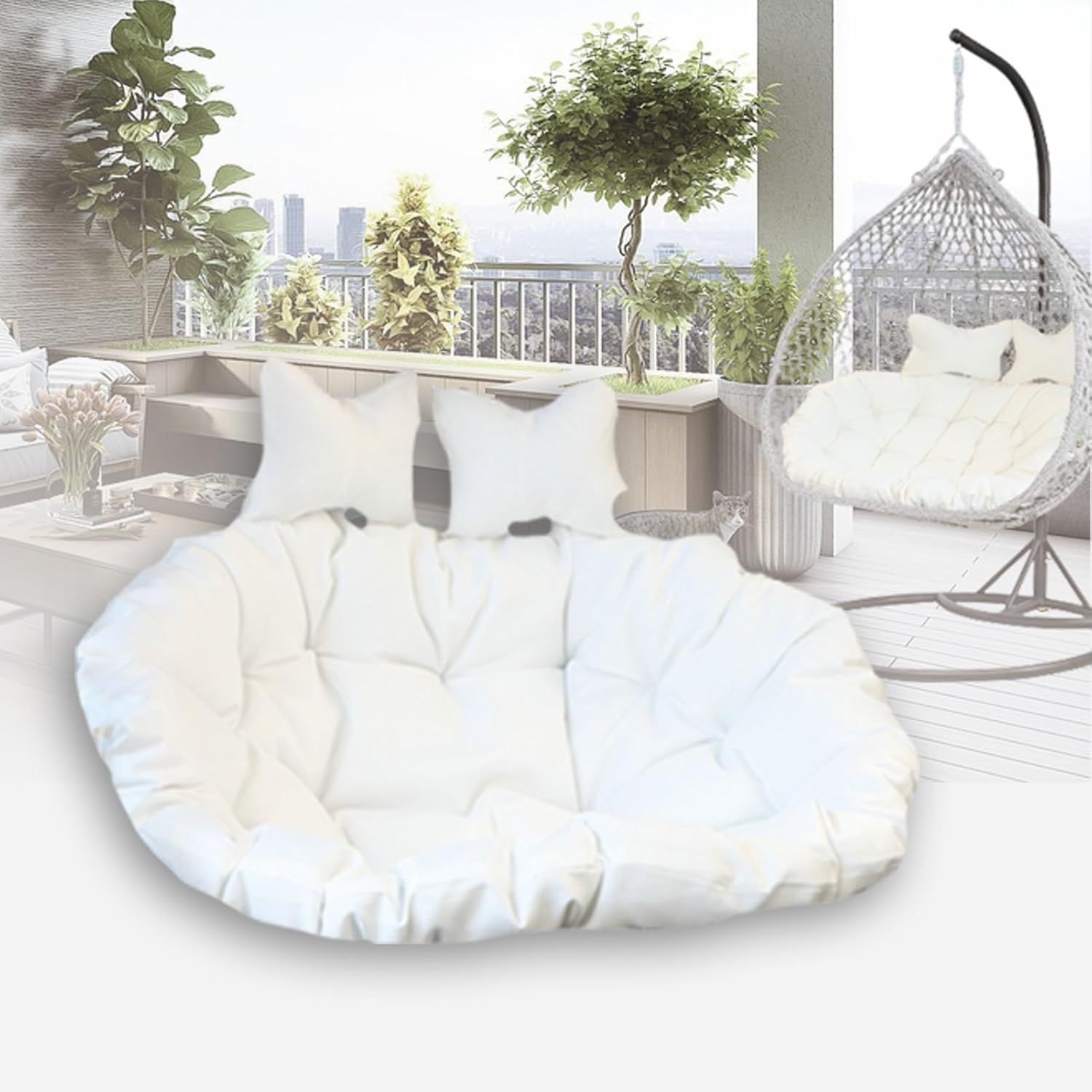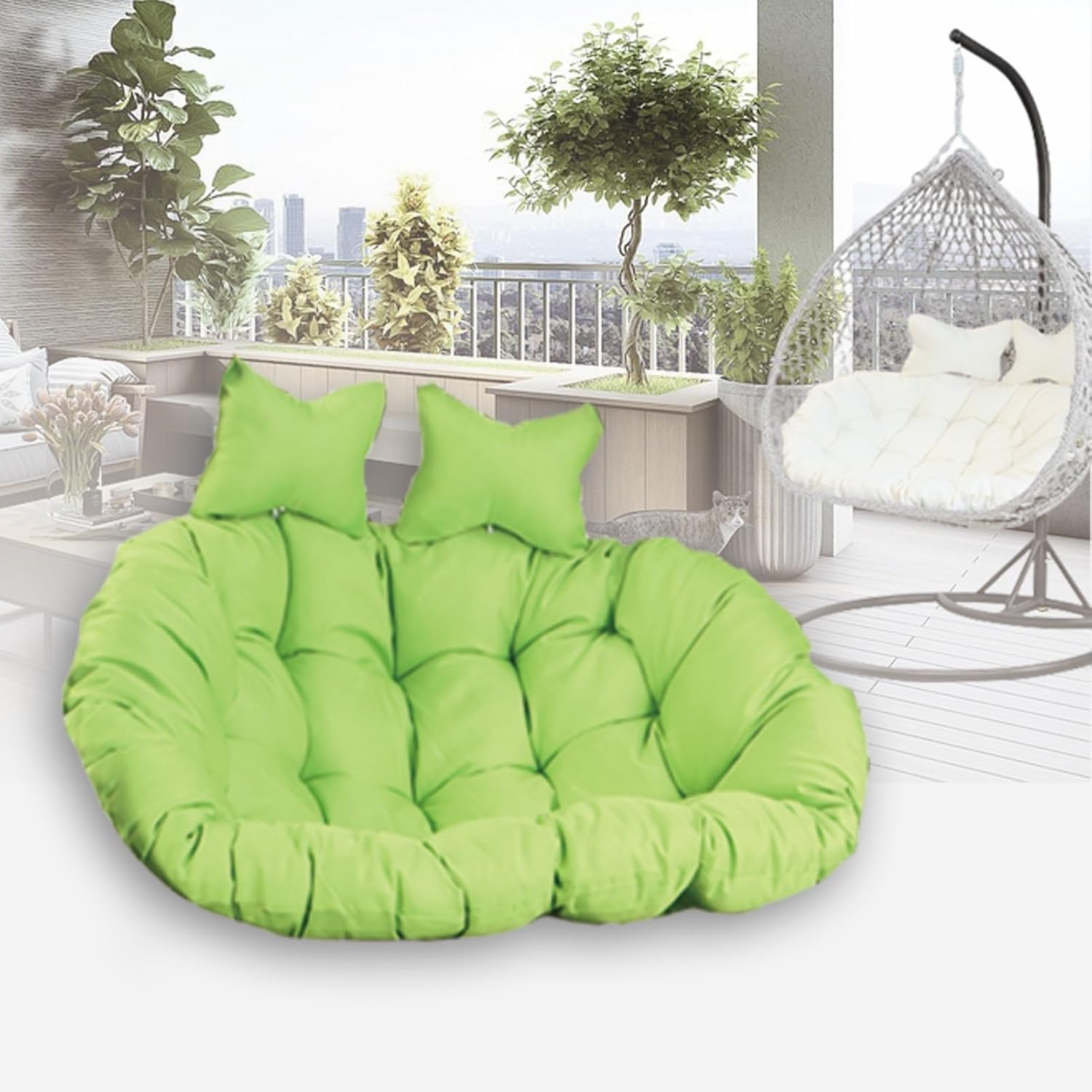 ** Double People Egg Chair Cushion- **Color Options:** Black, Sky Blue, Lake Blue, Green, Pink, Rose Pink, Red, Purple, Yellow, Orange, Beige, White, Khaki, Light Gray, Dark Gray, Brown, Big Red Flower, Rose- **Product Dimensions:** Expanded Size: 110x150x16 cm / 43.3x59x6.2 in (features a pair of straps on the left and right sides of the headrest)- **External/Cover Material:** 100% Quality Polyester- **Fill Material:** 100% PP Cotton- **Weight:** 5000 g- **Shape:** Round- **Usage:** Suitable for Indoor and Outdoor- **Product Care Instructions:** Spot clean, machine washable, detachable**SEASONS:** All-season replacement chair cushion, particularly ideal for summer. **STYLE:** Casual, classic, contemporary, Nordic style, Art Deco, chic. **FEATURES:** Water-resistant, sun-proof, anti-slip, ergonomic, comfortable, fade-resistant, suitable for all weather and seasonal use.**Package Includes:** 1 Hanging Egg Chair Cushion + 2 Adjustable Headrest Pillows.**Please Note Before Ordering:**Due to variations in monitor settings, colors may differ slightly from what you expect. Allow 12-24 hours for the cushion to regain its fluffiness after unpacking. For a quicker way to fluff up the cushion, place it in a dryer with a steam option for about 10 minutes or toss it in with a wet towel, and most wrinkles will vanish.