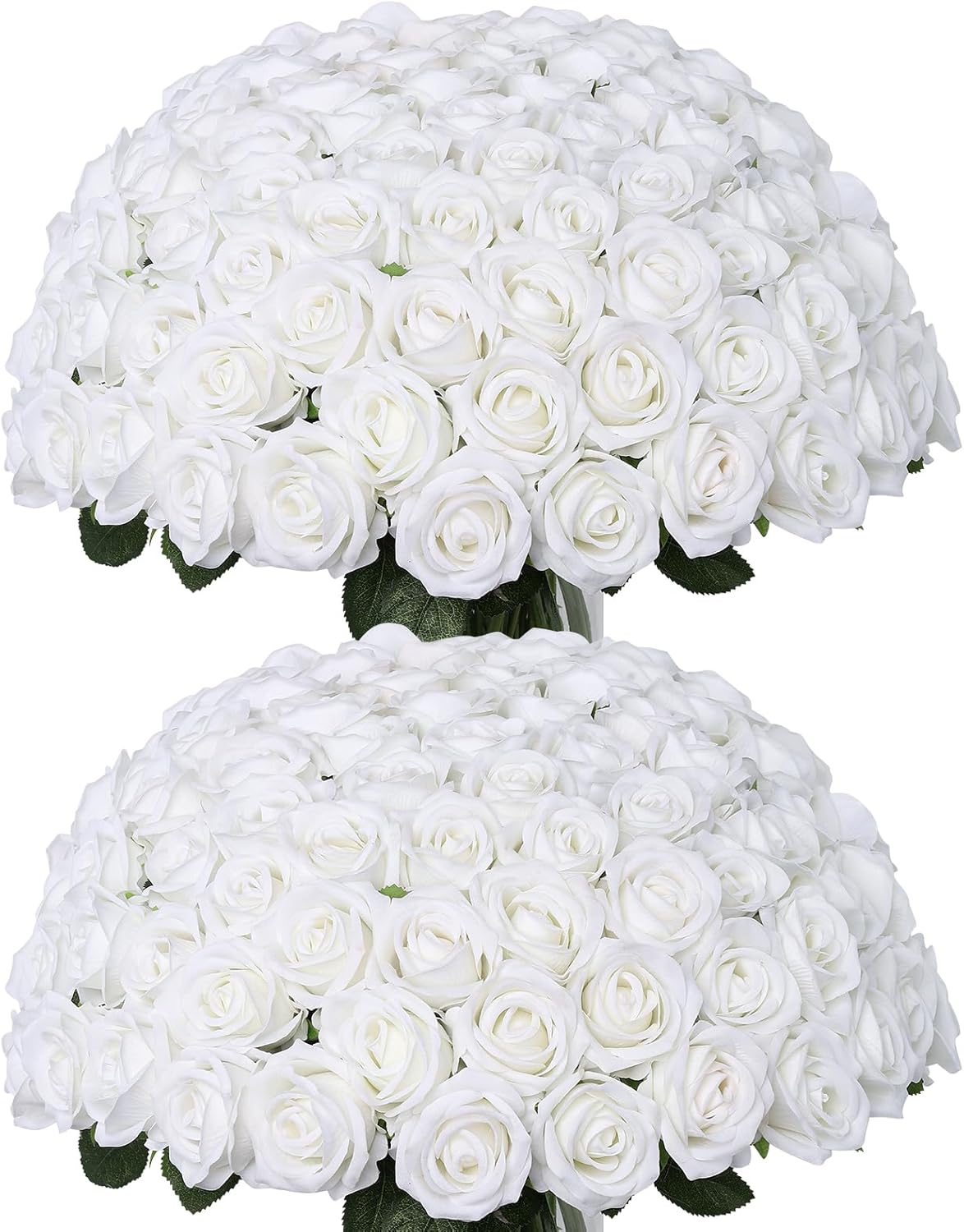 DuHouse 50 Pcs Red Roses Artificial Flowers,Fake Velvet Rose Bulk, Artificial Roses Bouquet with Long Stems for Wedding Party Arrangement Centerpiece Decorations