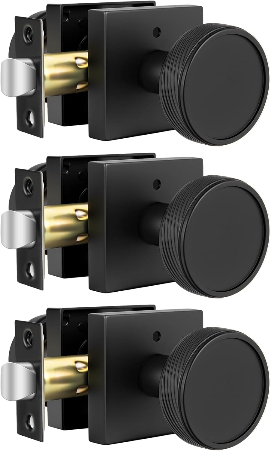 • 【Fits Standard U.S. Doors】 -- No need to worry about sizing. Reversible brushed gold door knobs swivel left or right, suitable for 1 3/8" to 1 3/4" thick doors. Adjustable latch to fit 2 3/8" or 2 3/4" backsets. Please measure door thickness and base before purchasing!