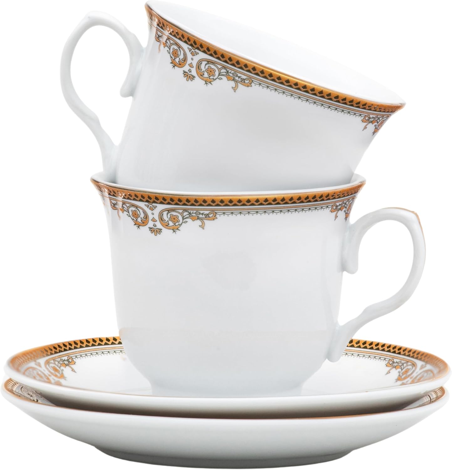 Experience the perfect blend of elegance and functionality with our 8 piece Porcelain Tea Set. This beautifully crafted set features a timeless white design adorned with a delicate gold floral edge, adding a touch of sophistication to any occasion. Whether you're hosting a refined tea party or enjoying a quiet moment with a cup of cappuccino, this set is designed to impress.This luxurious set includes:(4) porcelain tea cups (6.5 oz each)(4) matching saucers (5.5 inches each)Each piece in this set is made from quality porcelain, ensuring durability and a long-lasting addition to your kitchen. The cups and saucers are dishwasher safe, offering ease of use and maintenance without compromising their elegant appearance.Ideal for tea enthusiasts and those who appreciate vintage kitchen decor, this tea set is ideal for adults who love hosting tea parties or simply savoring a warm beverage. Its versatile design makes it suitable for both special occasions and everyday use, adding a touch of charm to any setting.This set also makes an excellent gift, with each piece thoughtfully packed in secure packaging to help maintain its condition during delivery. Whether you're gifting it to a loved one or treating yourself, our Porcelain Tea Set promises to enhance your tea drinking experience and bring a sense of elegance to your home. Embrace the beauty and quality of this exquisite tea set and elevate your tea moments to a new level of sophistication.