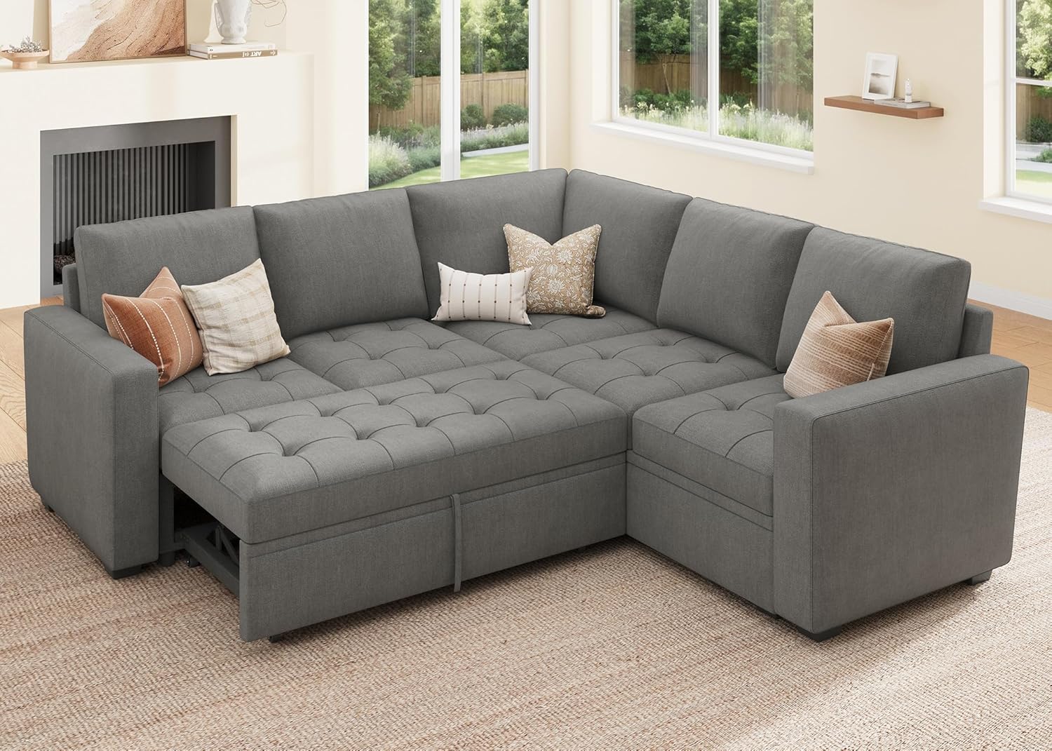 HONBAY Modular Sectional Sleeper Sofa with Pull Out Bed, Linen Convertible L Shaped Couch with Storage Seat, Sectional Couches for Living Room,Grey