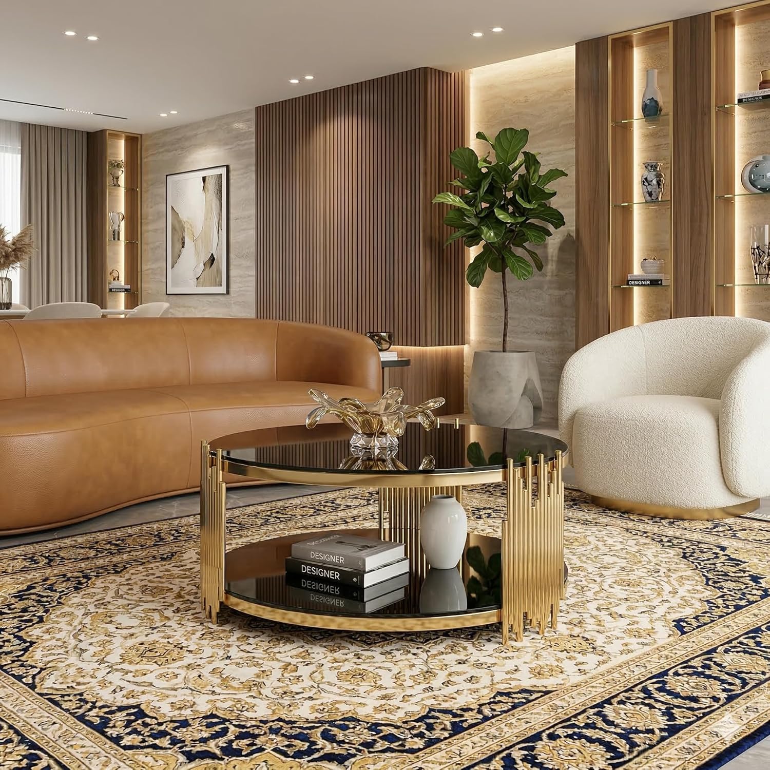 Elevate Your Space with the howcool Luxury Gold & Black Glass End TableTransform your living room, bedroom, or home office with a touch of modern glamour. The howcool Round Glass End Table seamlessly blends high-end aesthetics with practical everyday functionality. Designed for those who appreciate contemporary luxury, this striking accent piece features a dazzling mirror-gold stainless steel base paired with deep black tempered glass.Distinctive Design Meets Everyday DurabilityUnlike standard side tables, our unique base features a "rhythm wave" arrangement of vertical metal rods, creating a dynamic, architectural look that catches the light from every angle. Beyond its stunning appearance, this table is built to last:Premium Tempered Glass: Both top and bottom tiers are made from high-strength black tempered glass that is heat-resistant, shatter-proof, and incredibly easy to wipe down.Solid Stainless Steel: The gold-finished frame is rust-resistant, sturdy, and offers wobble-free support.Floor Protection: Specially designed non-slip foot pads ensure your floors remain scratch-free while keeping the table firmly in place.Double the Storage, Perfect ProportionsMeasuring 17.72" W x 21.65" H, this table boasts a compact footprint ideal for apartments or tight corners. The smart 2-tier design doubles your display and storage area. Keep your coffee, remote, and phone on the top tier, while storing books, magazines, or a decorative display on the bottom shelf.Specifications:Overall Dimensions: 17.72" Diameter x 21.65" HeightMaterial: Black Tempered Glass & Stainless Steel FrameColor: Black Glass / Mirror Gold BaseStyle: Modern, Contemporary, Luxury, Mid-CenturyApplication: Side Table, End Table, Nightstand, Corner Table, Display StandBring home the perfect combination of form and function. Add the howcool Gold Accent Table to your cart today and redefine your interior style!