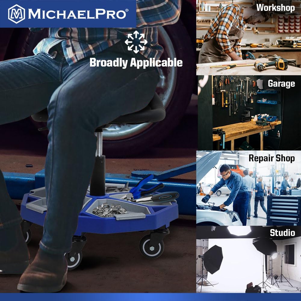 MichaelPro Rolling Mechanic Stool with 5 Removable Tool Trays for Storage, Pneumatic Garage Shop Chair with 350 lb Capacity, Adjustable Height, Padded Swivel Shop Stool with Wheels, Brakes, Backrest