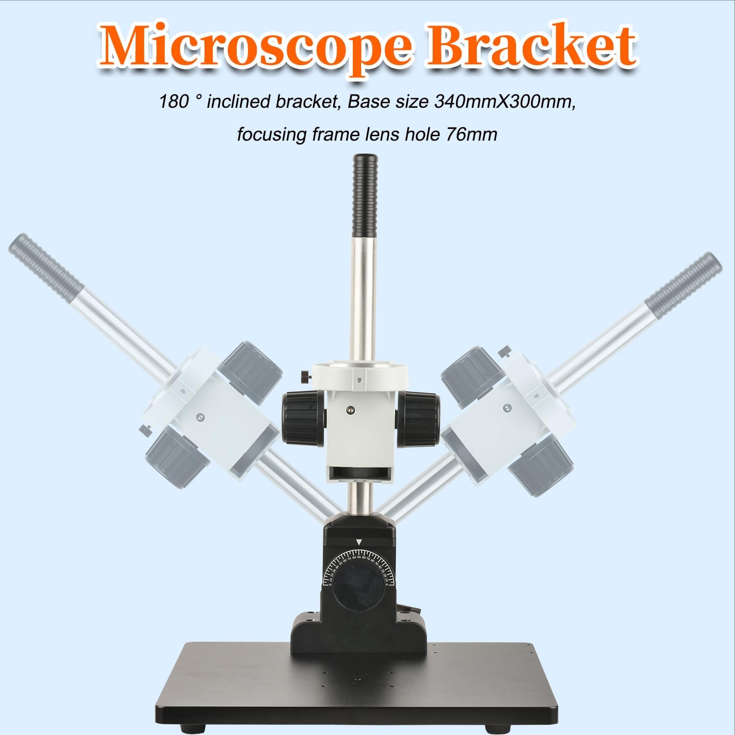 Model:KP-F176 Base Size:340X300X10mm Column:Vertical column 345mm,diameter 25mm, adjustable angle of column 180 degrees Focusing Bracket: Center distance 155mm,lens aperture 76mm Weight:17KG Material:aluminium alloy Packing List: 1. 345mm Column *1 2. Anti Slip Ring *1 3. Base *1 4. 76mm Focusing Frame *1