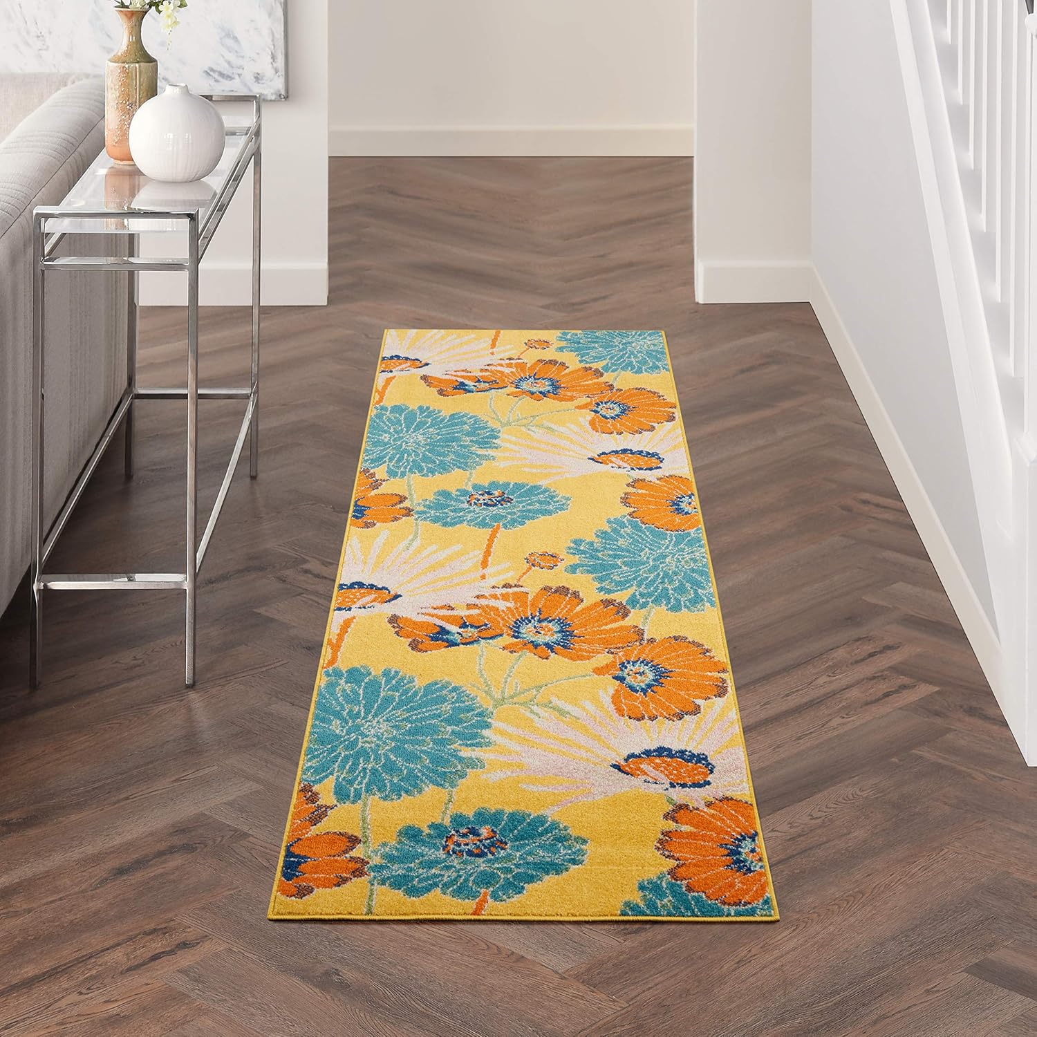 Fill your space with the warmth and comfort of the Allur Collection. With its eclectic mix of contemporary florals, Persian-inspired medallions, and tribal patterns in bright jewel tones, each Allur area rug exudes boho appeal. These vibrant rugs are Ideal for use in your living room, bedroom, or home office. Machine made of low shed, low profile polypropylene for easy cleaning. Invite a light and airy vibe to your surroundings with this Allur Collection area rug. In this botanical scene, vibrant orange, turquoise blue, and ivory floral motifs are woven onto a golden yellow ground for a lush complement to contemporary settings. This colorful area rug is machine made of easy-clean polypropylene fibers for worry free upkeep.