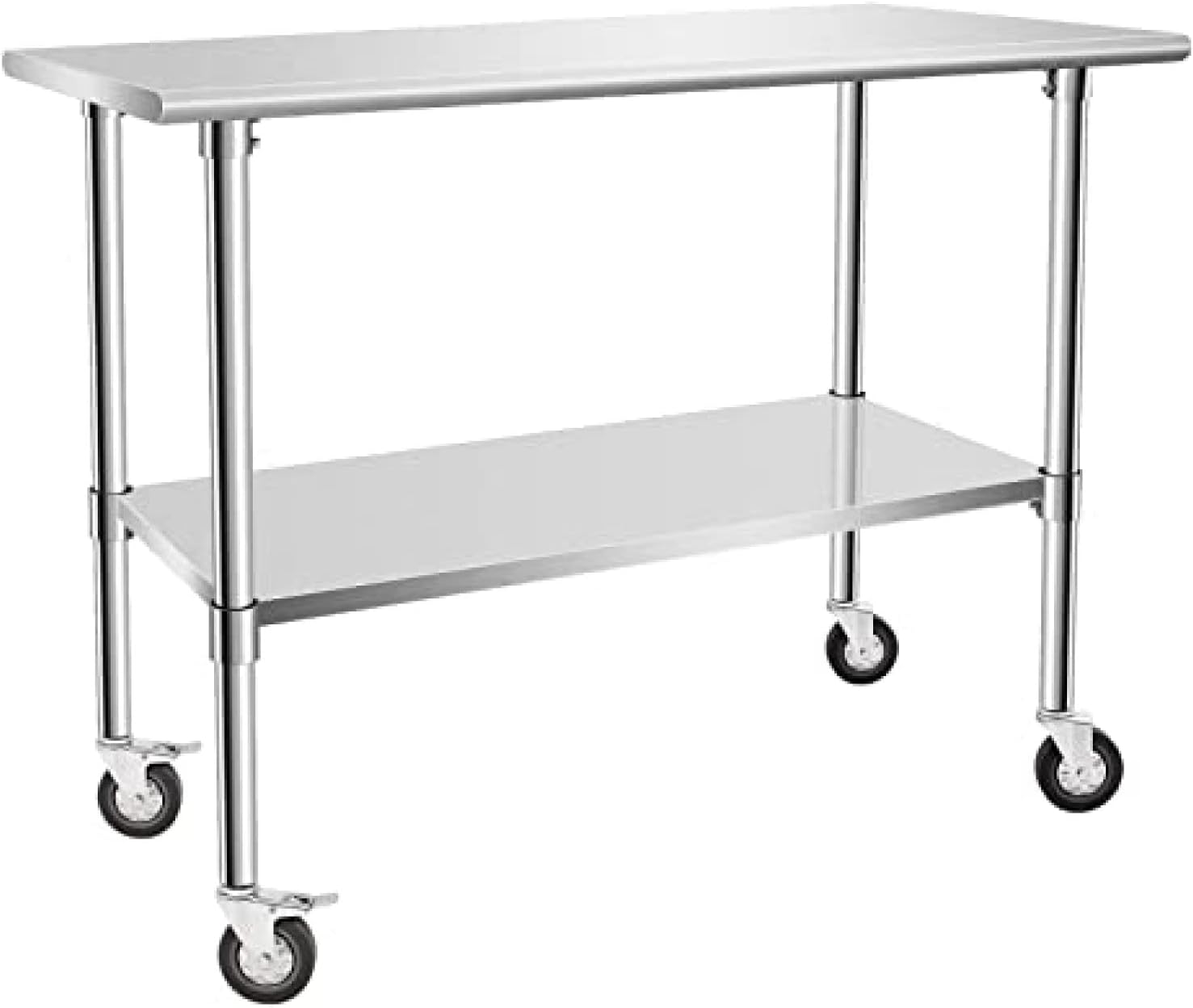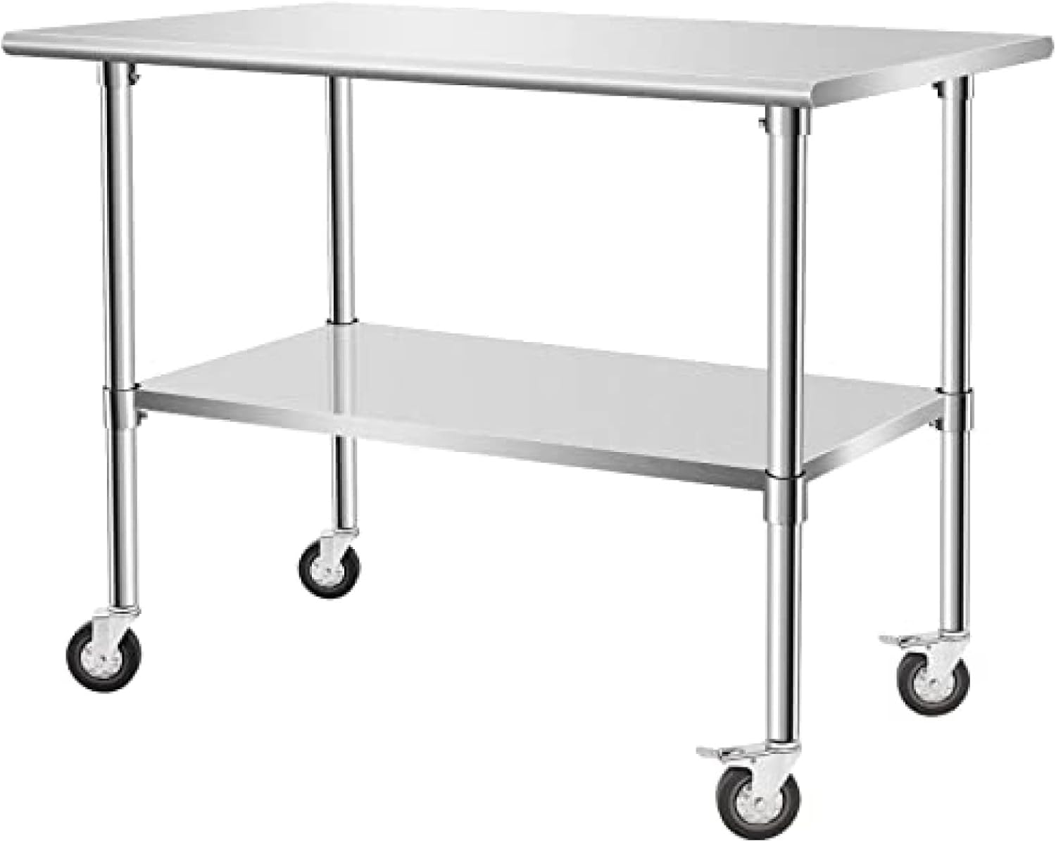 **Stable Caster Design**Equipped with four durable caster wheels featuring a locking brake, this mobile work table glides effortlessly across your space while maintaining stability when stationary. It can also be converted to use bullet feet, allowing for customizable height adjustments based on your needs.**Adjustable Under Shelf**Optimize your storage with an adjustable under-shelf that offers multiple height settings. This feature allows you to create the perfect amount of space for your kitchen essentials, maximizing organization and accessibility.**Superior Polished Surface**Our work table boasts a polished surface that is not only visually appealing but also easy to clean. NSF certified for commercial use, it combines quality with outstanding anti-rust properties. The galvanized under-shelf adds extra durability and support, ensuring stability for all your culinary tasks.**Versatile Usage**This versatile work table is perfect for various environments:- **Home Kitchen:** With its mobility, this table makes it easy to access ingredients and utensils, turning cooking into a delightful experience.- **Laundry Room:** Reduce the strain of carrying heavy loads by using this table for sorting and folding clothes, giving you more time to enjoy with family.- **Garage:** Its sturdy construction and mobility create a reliable workspace that enhances your productivity, whether for projects or repairs.- **Commercial Kitchen:** In busy kitchens, organization is key. This table provides a durable, flexible, and easy-to-clean surface, helping maintain a well-ordered cooking environment.**Specifications**- **Tabletop:** 18GA 430 Stainless Steel- **Under Shelf & Legs:** 18GA Galvanized Steel- **Included Accessories:** Tabletop, under shelf, legs, casters, screw sets, installation manualTransform your cooking and workspaces with this multifunctional...