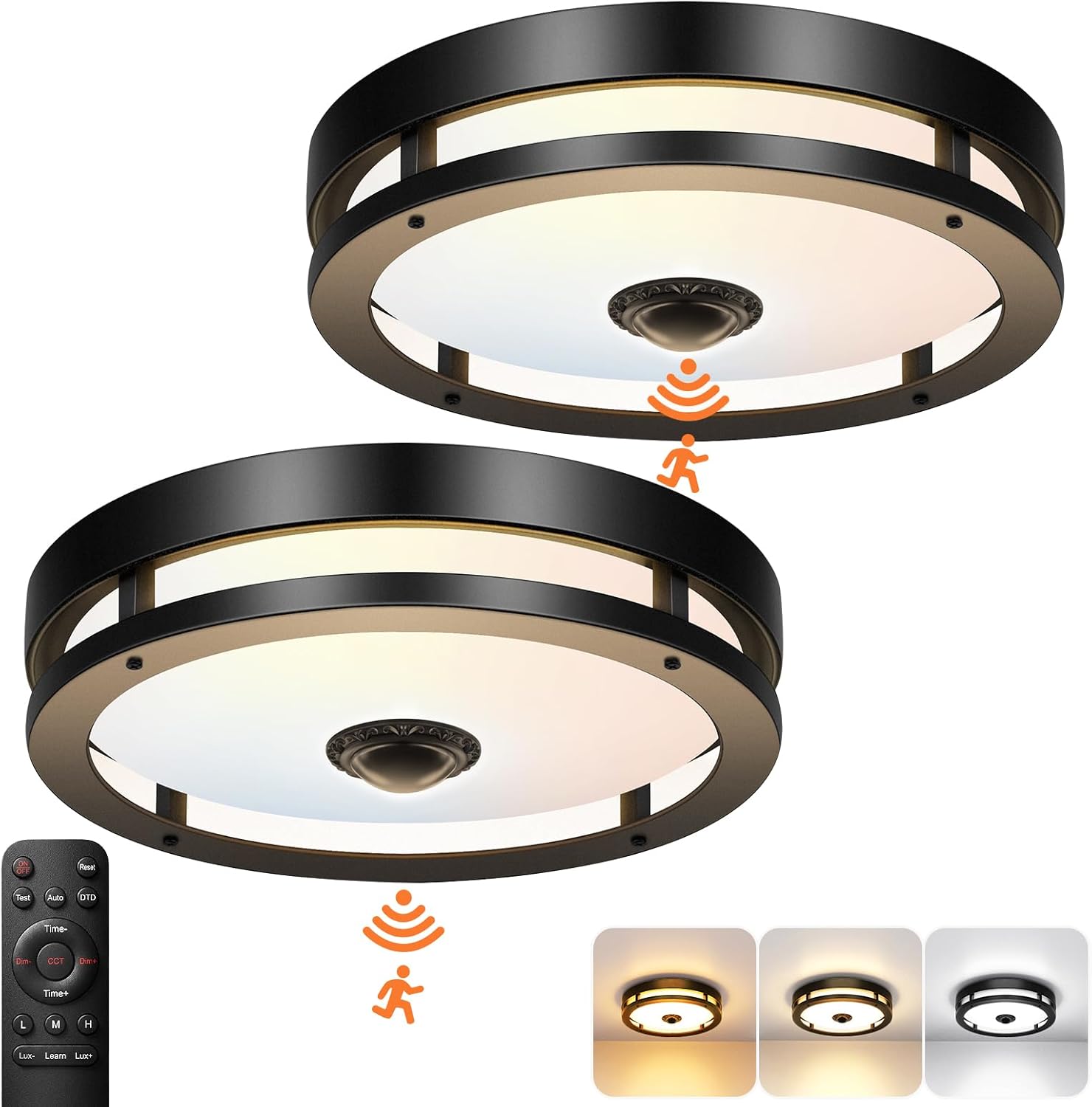 Outdoor Motion Sensor Ceiling Light with Remote,24W Dimmable & 2700K-3000K Adjustable Exterior Flush Mount Ceiling Lights,12" Outdoor Porch Light Fixture for Garage,Entryway,Patio,2 Pack