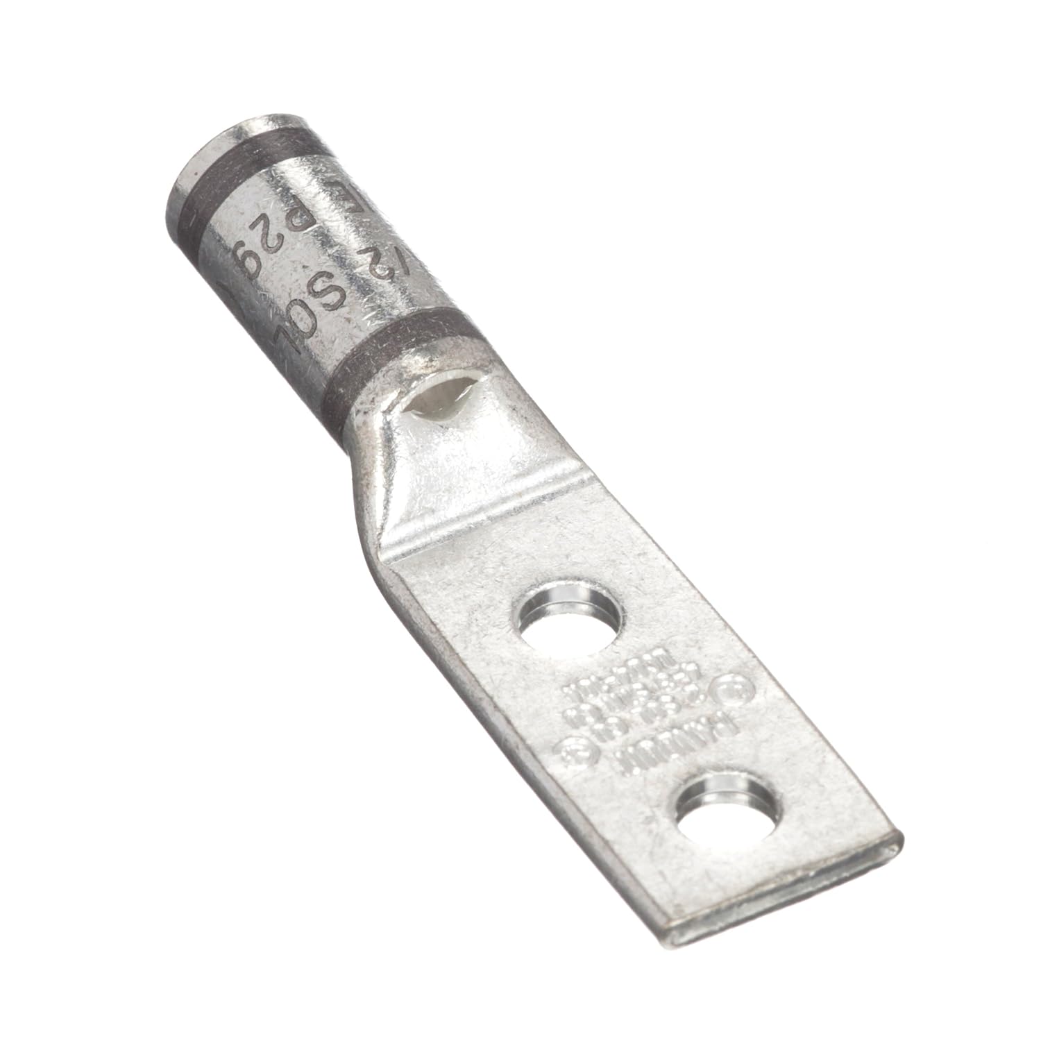 Two-hole, standard barrel lug with window, 1 AWG wire, 1 stud hole, . 63 hole spacing. Tin plated to inhibit corrosion, color coded barrel, inspection window, NEBS level 3.