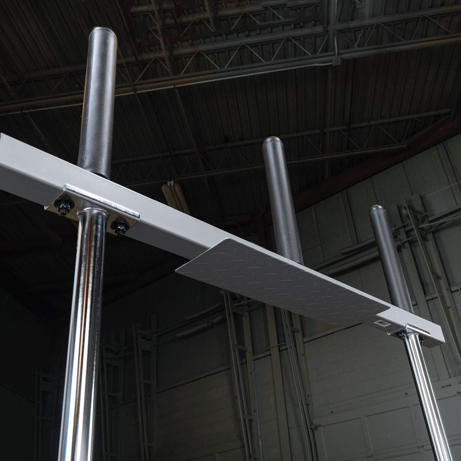 The unique vertical design not only reinforces support for your back and hips but also minimizes space used to perform the exercises. Extra thick back pad and contoured head and neck pad lock you into the proper exercise position while providing comfort during your leg press or calf raise routines. Features include dual adjustable half inch steel locking pins three different starting and stopping positions and a diamond plate steel press deck for no slip control. Three 1" standard plate posts allow increased resistance for a progressive challenge every time you workout. The PVLP56W is crafted of durable alloy steel with an extremely tough powder coat finish. 400 lb. weight capacity. Olympic adapter sleeves are optional. Weight plate posts are 1" in diameter. Shown with optional Olympic Adapter Sleeves. Olympic Adapter Sleeves weight plates and collars optional.