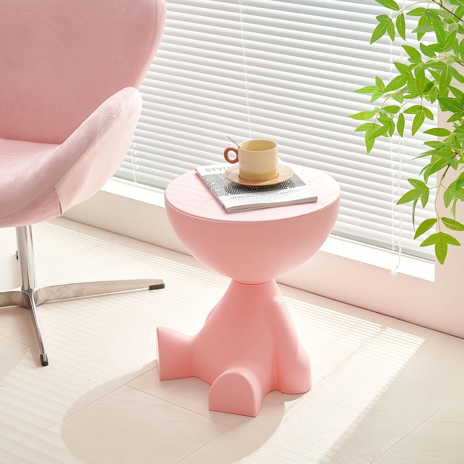 Features: 1. Round desk, unique design, can also be used as a chair. Applicable to living room, bedroom, study, office. Shape: circular, body shape. 2. Unique design, style suitable for all your furniture, decorate your house. 3. Place this cute side table next to the sofa to place tea, keys, remote controls and other small items so they are easy to reach when taking with you. The creative shape is also a highlight of the house. Specifications Name: Side table Size: 11 x 14 x 16 inches Whether to be assembled: No Material: Large, durable, sturdy plastic Style positioning: Artistic style Style: Modern style, cute, cartoon, fashionable, elegant Usage scenario: Suitable for home decoration and office, can stand on the floor of living room and bedroom.