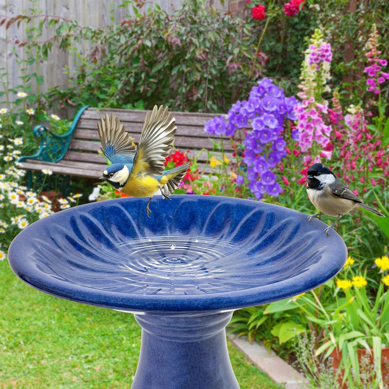 Add a touch of elegance to the yard or garden with this shallow bird bath. Made from frost- and UV-resistant ceramic to resist the outdoor elements, this pedestal bird bath features a vibrant blue finish with a stylish raised daisy design in the the bowl. The bowl is capable of holding up to 1 gallon so there is plenty of water for feathered friends to splash and preen. Assembling this bird bath is easy, simply align the notches on the bowl with the grooves on the pedestal and gently but firmly twist the bowl to lock it onto the pedestal. No tools or hardware are required for assembly. This sophisticated bird bath with pedestal is a stylish addition to the garden, patio, or front porch. To attract more birds, try to place this bird bath in a slightly shaded area with nearby tree or bush shelter.