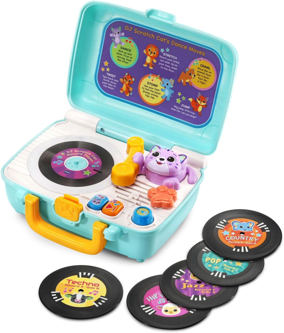 Hey DJ, play that song! Cool cats can spin some mixes with the five included double-sided records. On one side, listen to music in jazz, pop, techno, country and hip hop styles; then flip them over to explore different animal sounds, like the roar of a lion or a horse’s whinny. Keep the role-play going with a turntable that lights up as it spins and a kitty assistant whose head bops along to the beats. Skip ahead to find a favorite song and create unique remixes by layering in the cute animal sounds. Convenient record storage and a carrying handle let mini DJs flip the records, scratch like a pro and go on a musical adventure here, there or anywhere. Let’s mix some beats! Intended for ages 12-36 months. Requires 3 AA batteries. Batteries included for demo purposes only. New batteries recommended for regular use.