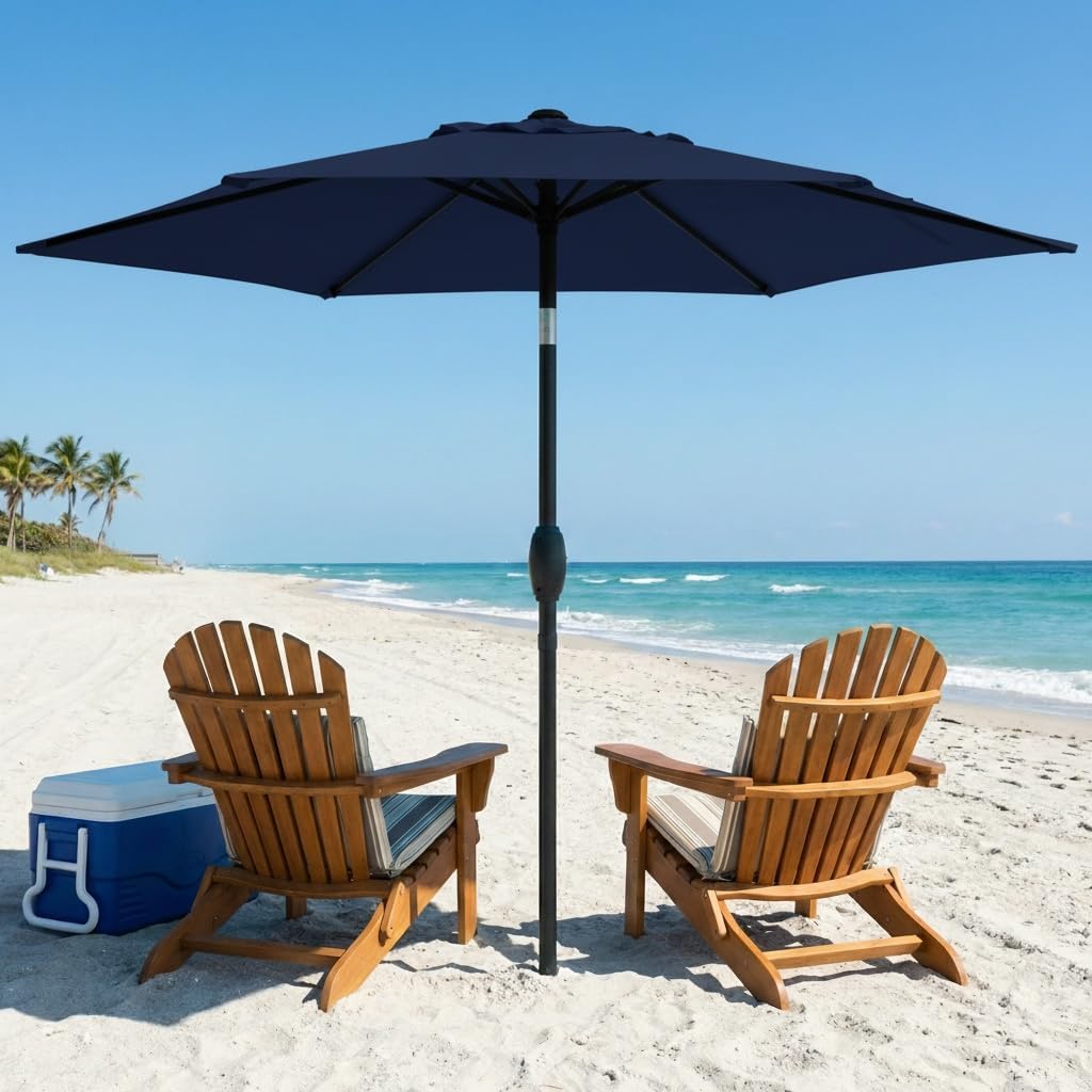 This 7.5' patio umbrella is crafted with 200g/sqm 100% polyester fabric that is waterproof, UV-resistant, and fade-resistant, achieving Grade 4 colorfastness after 400 hours of testing to maintain its vibrant appearance over time. The umbrella features a sturdy frame with a 1.5" powder-coated metal pole that resists rust and bending, paired with six thickened steel ribs for enhanced stability and long-lasting support. Designed for ease of use, the smooth crank lift system allows quick opening and closing, while the push-button tilt function provides flexible, multi-angle shade coverage so the sun stays out from both sides. A single top ventilation hole improves airflow, reduces wind pressure, and helps prevent tipping in breezy conditions. Ideal for patios, gardens, beaches, plazas, and commercial outdoor spaces such as cafés and restaurants, this umbrella measures 87" x 87" x 85" (L × W × H, base not included), offering reliable shade for sunny days.