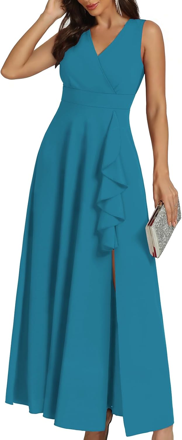 COOAN Women's Black Long Formal Dresses Cocktail Wedding Guest Dress Ruffle Split Elegant V Neck Party Gowns