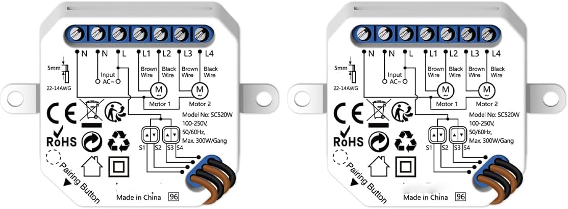 Wattage:300W/GangVoltage:110-240VModel Number:QC2-SC520WOrigin:Mainland ChinaCertification:CE,RohsApp Name:Tuya, Smart LifeSupport System:Both Android And IOSWorks For:Smart Blinds, Smart Curtain,Wireless Protocol:Wi-Fi 2.4Ghz, Not Support Wi-Fi 5GWorks With:Blinds Shutter With Electric MotorCompatible With:Tubular Motor With 4 WiresConnect With:Tubular Motor, Electric Blind MotorColor:WhiteNote Before Order! This is a Wi-Fi only Curtain Switch, it can’t work with our RF curtain remote. Please don’t buy the extra RF remote to add the remote control, they are not compatible. Please check your motor is with 4 wires (Blue Wire, Brown wire, Black Wire, Green/Yellow Wire) before you buy our. Before using App to control the shutter, please keep the wall manual switch at 'STOP' position, otherwise , the App can't work, it's to protect the motor. Please be noted this is a double curtain switch, please contact us if you have any questions. Voice control can be achieved through smart home devices (speakers). App Remote Control: Support Smart Life APP /Tuya APP. Timer and Schedule: You can set timer schedule for when to open or close your window or roller shutter. Motor Working Time Setting: The Motor Working Time can be set from 1-120 seconds, suitable for the use of large blinds. Wall Switch Control: After you install this module, your wall manual switch still works, it can open , or close the shutter. Device Sharing: You can create group in the APP to manage all the blinds in your house and share the devices to all your family members.
